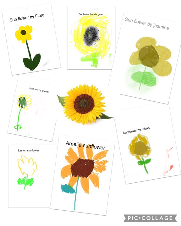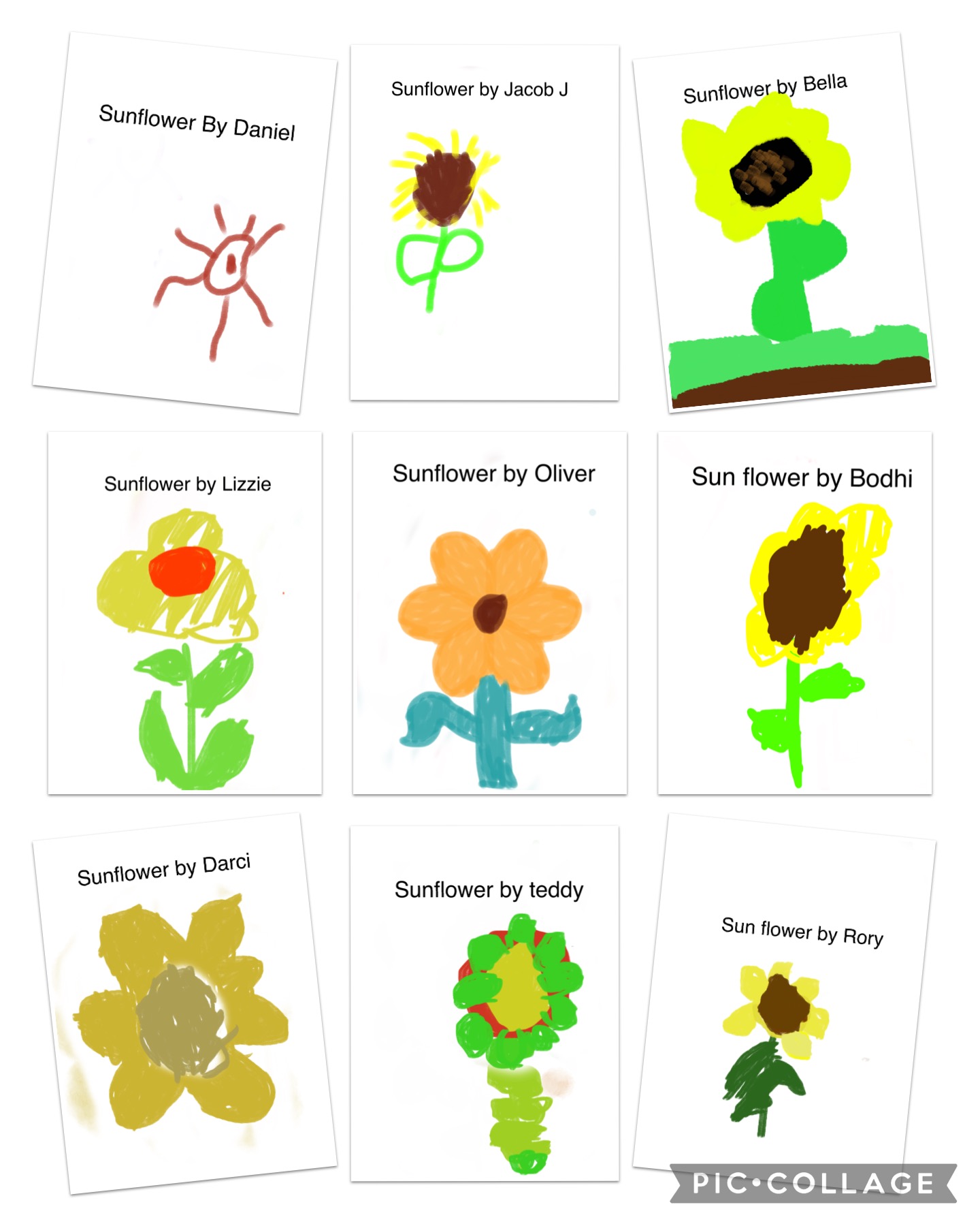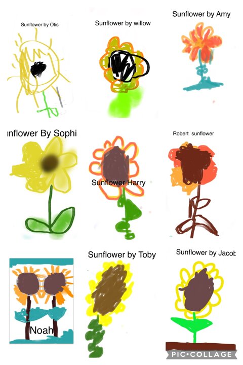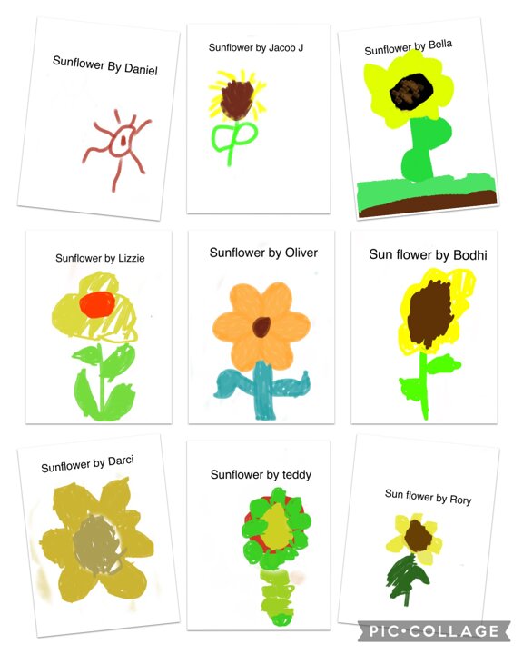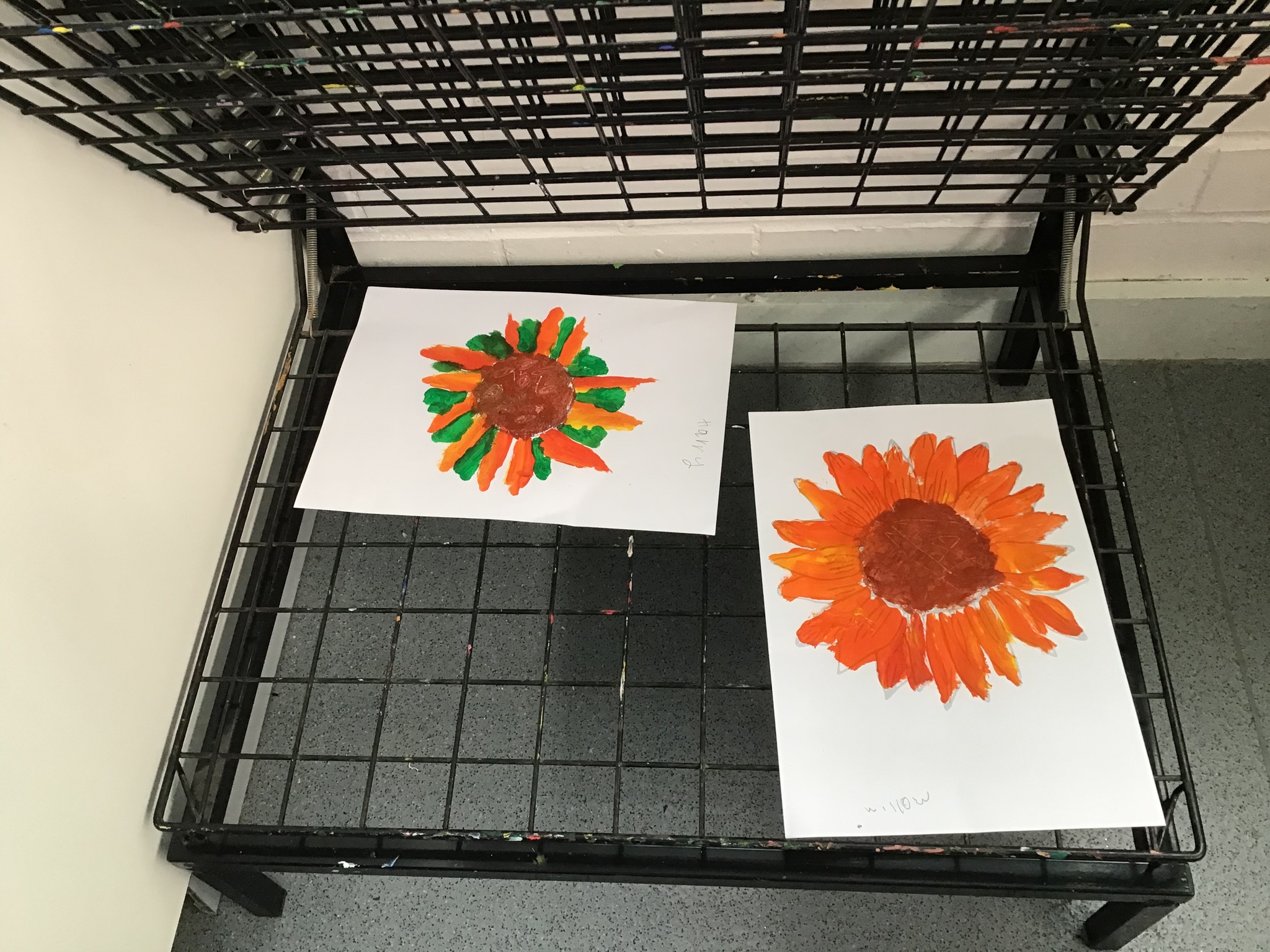 We know we will have to wait a long time until our sunflowers grow and so we decided to create our own. We were inspired by Van Gough to try using thick paint and adding texture by scratching in patterns. We also tried other techniques, we used water colour, wax crayon and pastels. We talked about which technique we liked best.