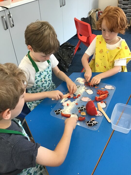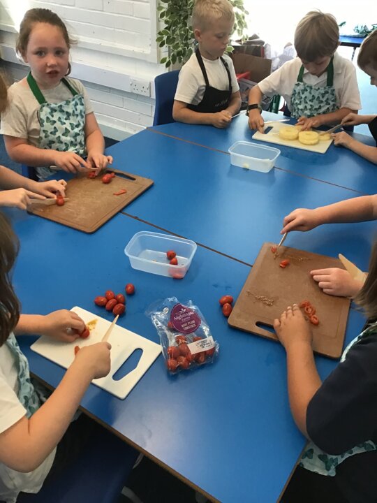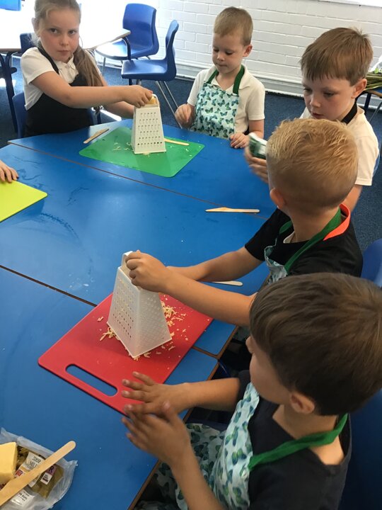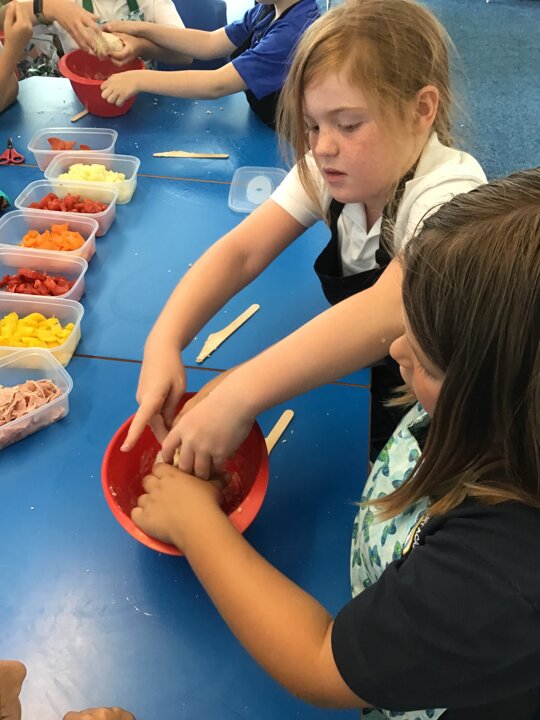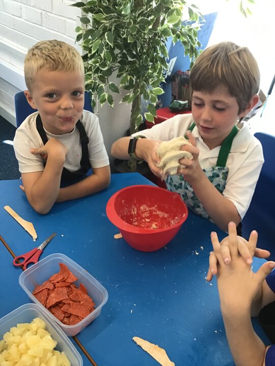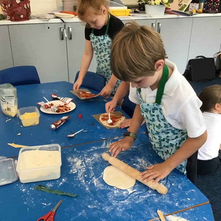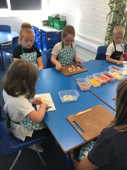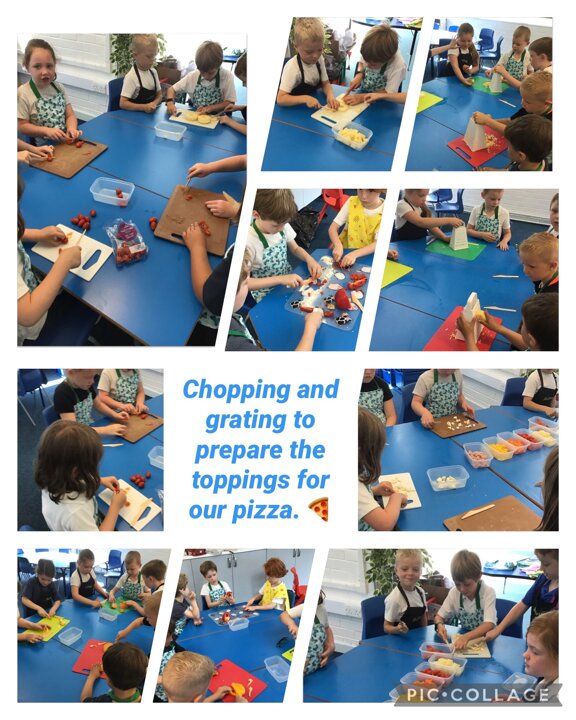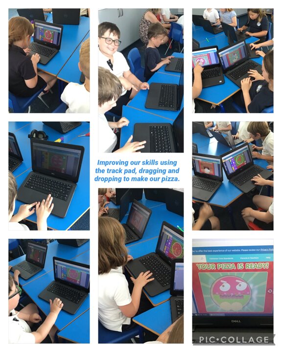 We have had a busy week making pizza, we have completed all kinds of challenges including improving our skills using the track pad dragging and dropping to make digital pizza. The real thing was much tastier, we all improved our skills using food preparation tools, we chopped, grated, mixed, kneaded, rolled and spread to make our own very tasty pizza, delicious.