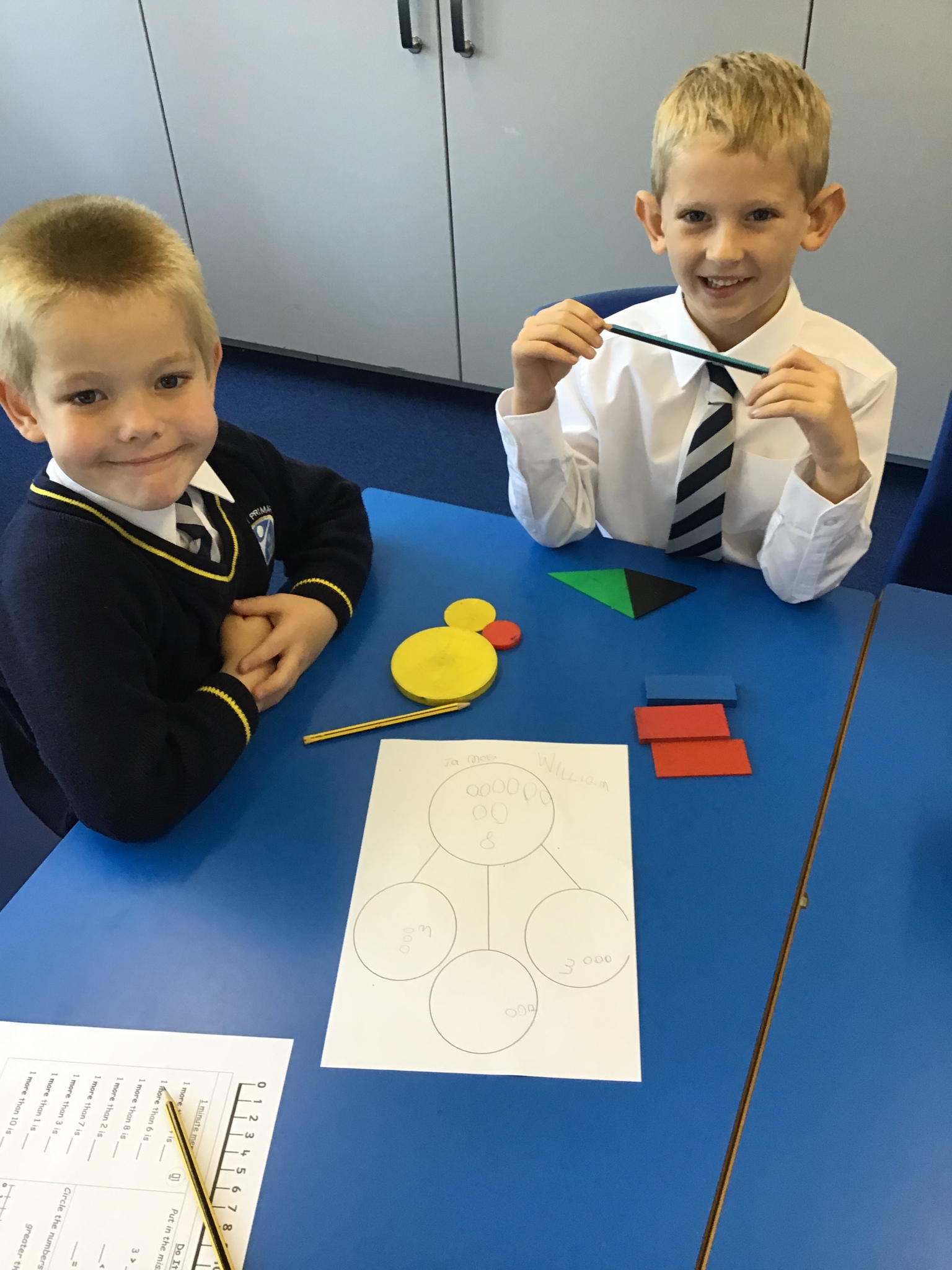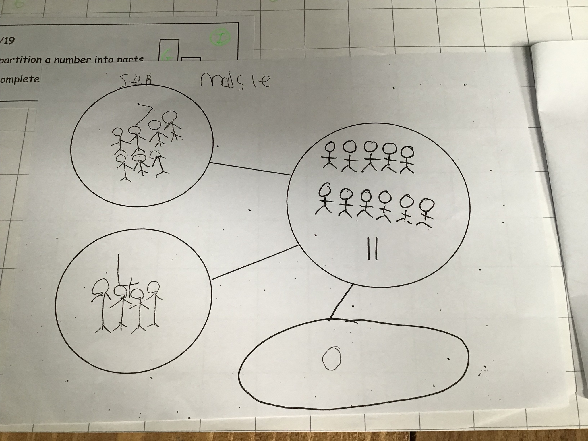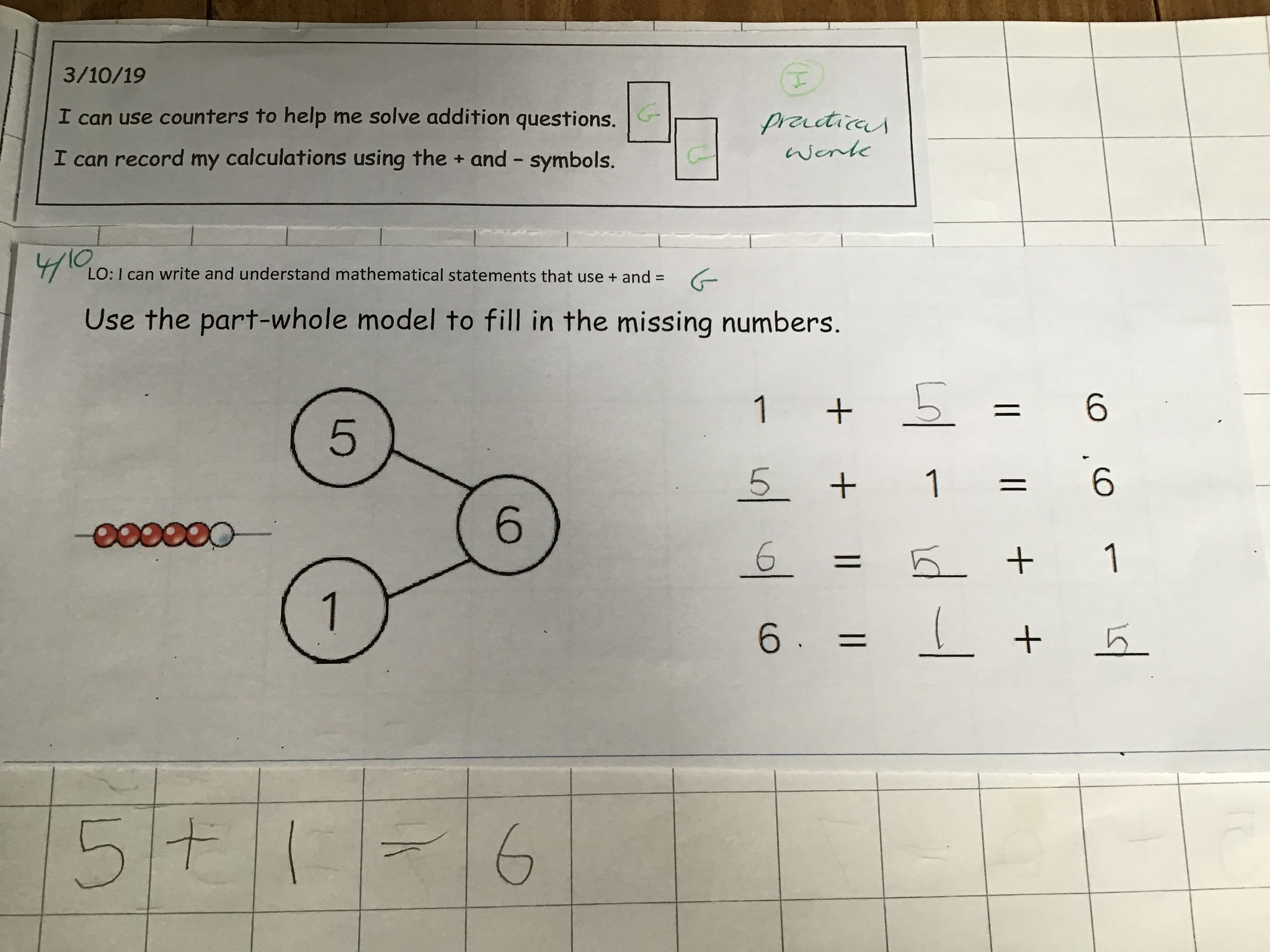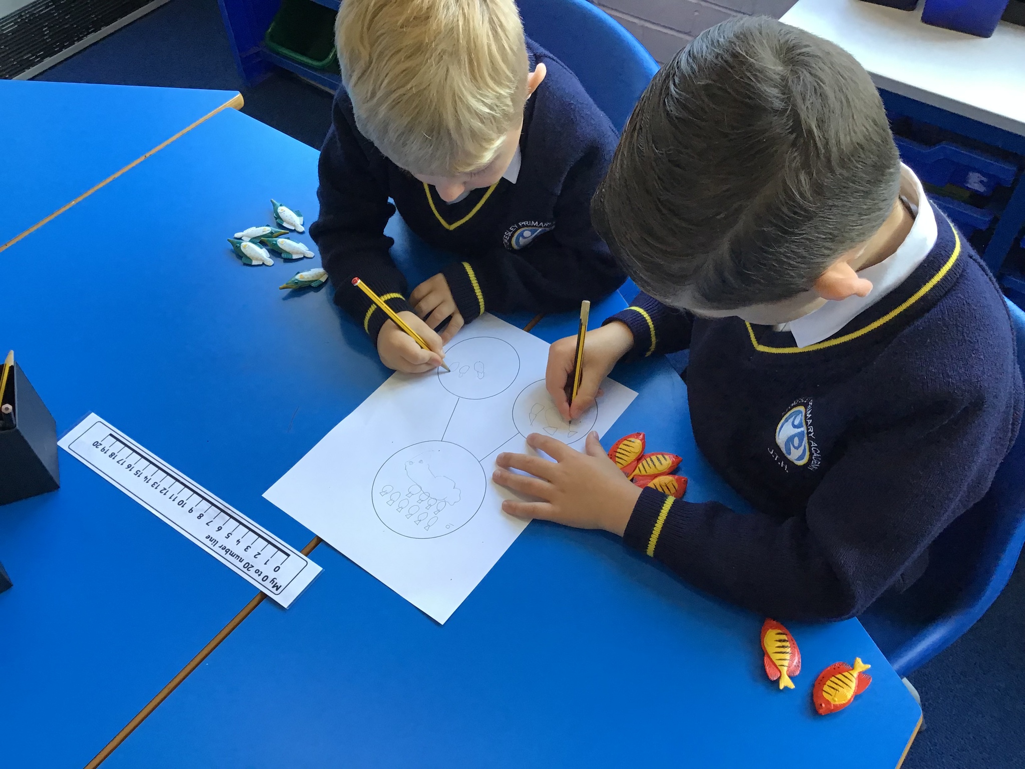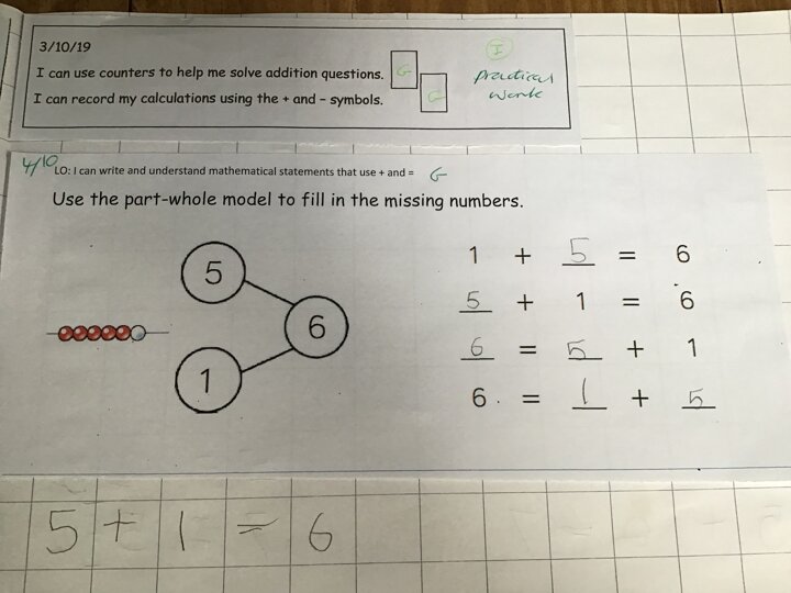 This week we have been using the part whole model to help us develop our understanding of the symbols + and =. The model is made up of one circle for each part ( the numbers that are to be added together) these are joined to a larger circle where the parts can be put together and we car work out what the whole number is. It is helpful to the children because they can use counters or draw pictures to help them work out the total. It is also helpful as it supports children to understand that 2+3 is the same as 3+2 and that addition can be done in any order. It will also help us next week when we begin learning our number bonds. These are pairs of numbers that make a given total e.g. 1+4 2+3 0+5 all equal 5. Rapid recall of these number facts is one of our Year One non-negotiable skills, this means by the end of the year we will be experts at knowing our number bonds. Practising regularly at home in different ways can really help.