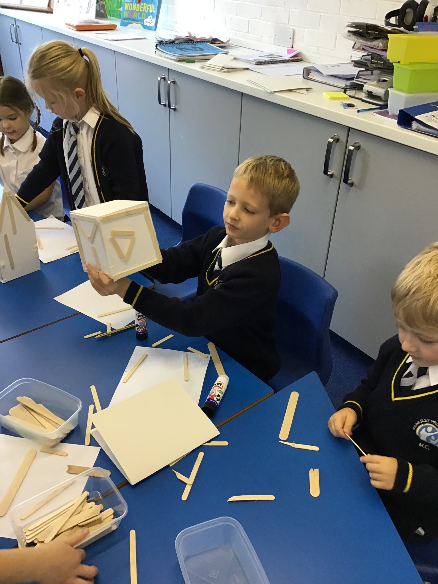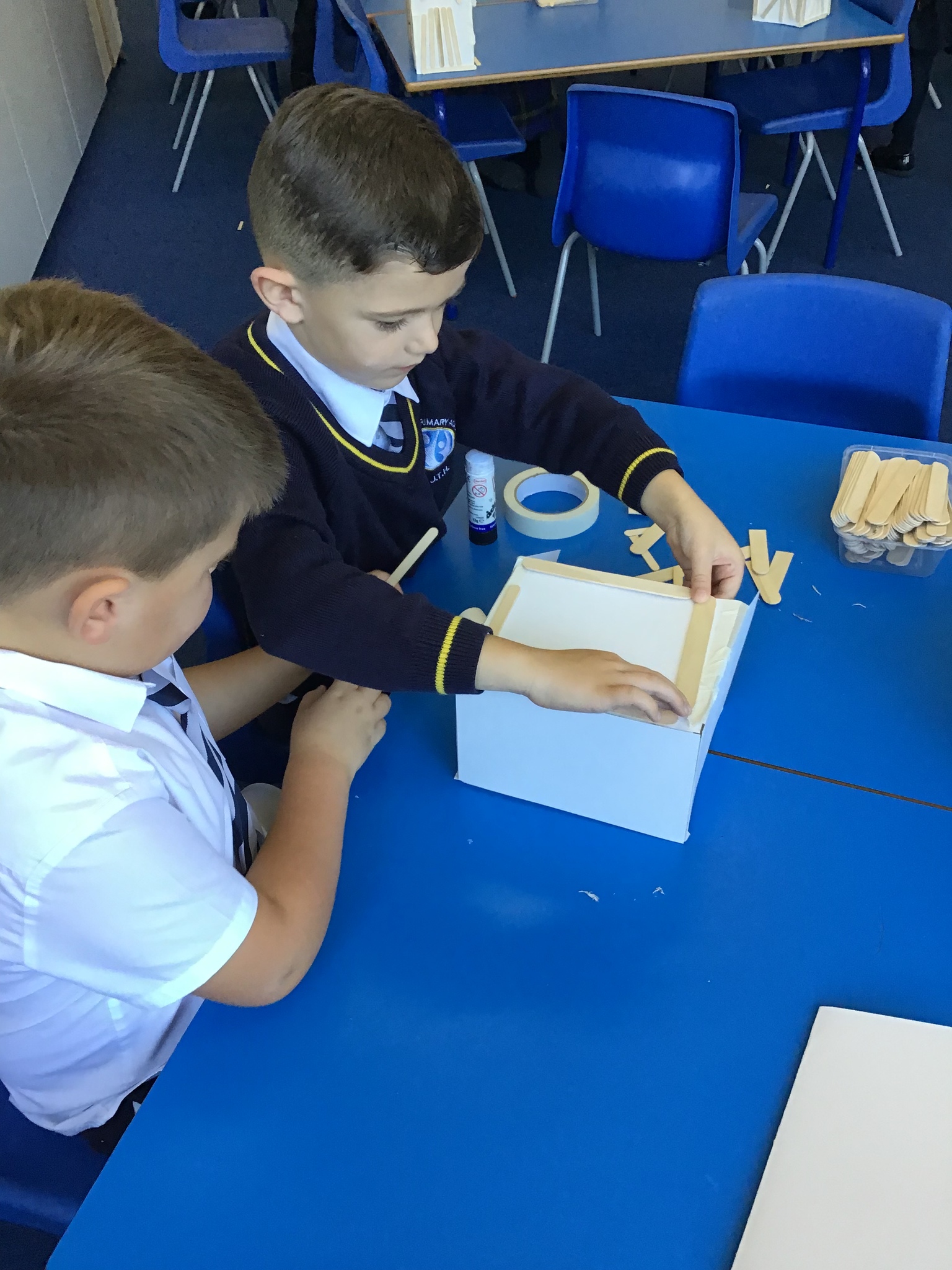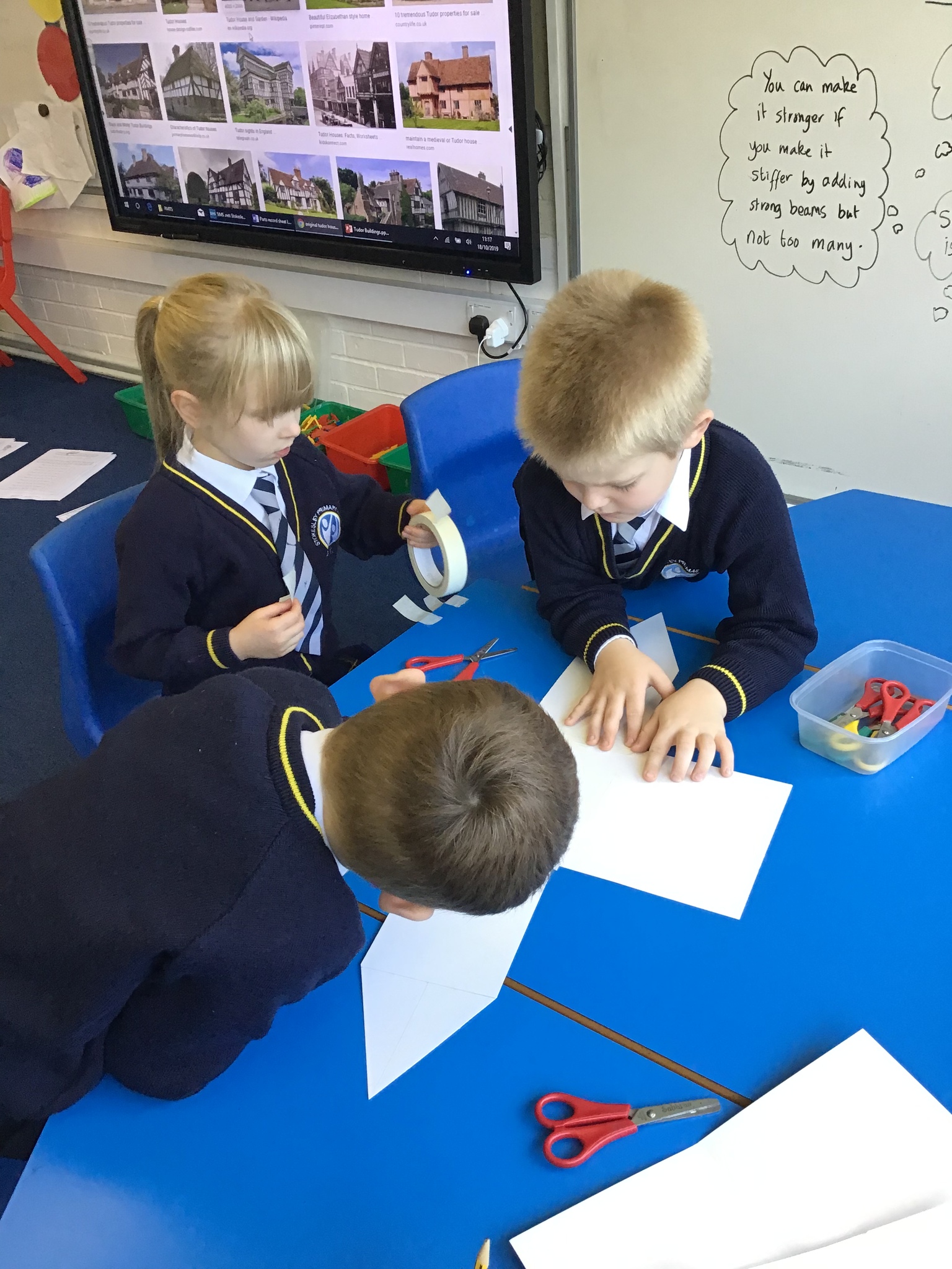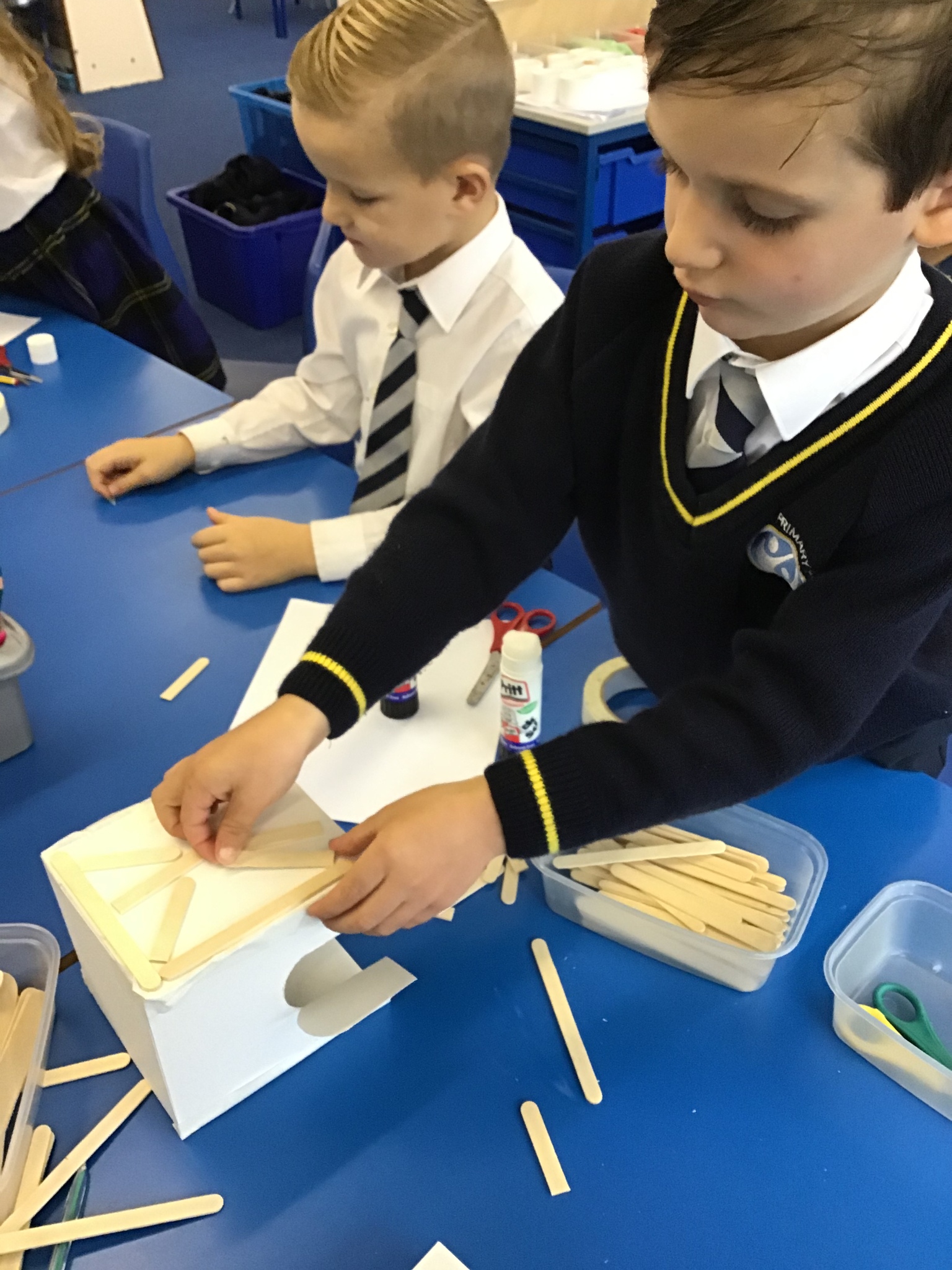 What amazing work today. The children worked so hard to assemble their houses from the shapes they had chosen and worked brilliantly as teams to make their houses. We used wooden sticks to strengthen the model just like real Tudor houses. Next we will focus on adding details to make our model very realistic. I am very very proud of Year One today as this was a super tricky challenge!!!!!