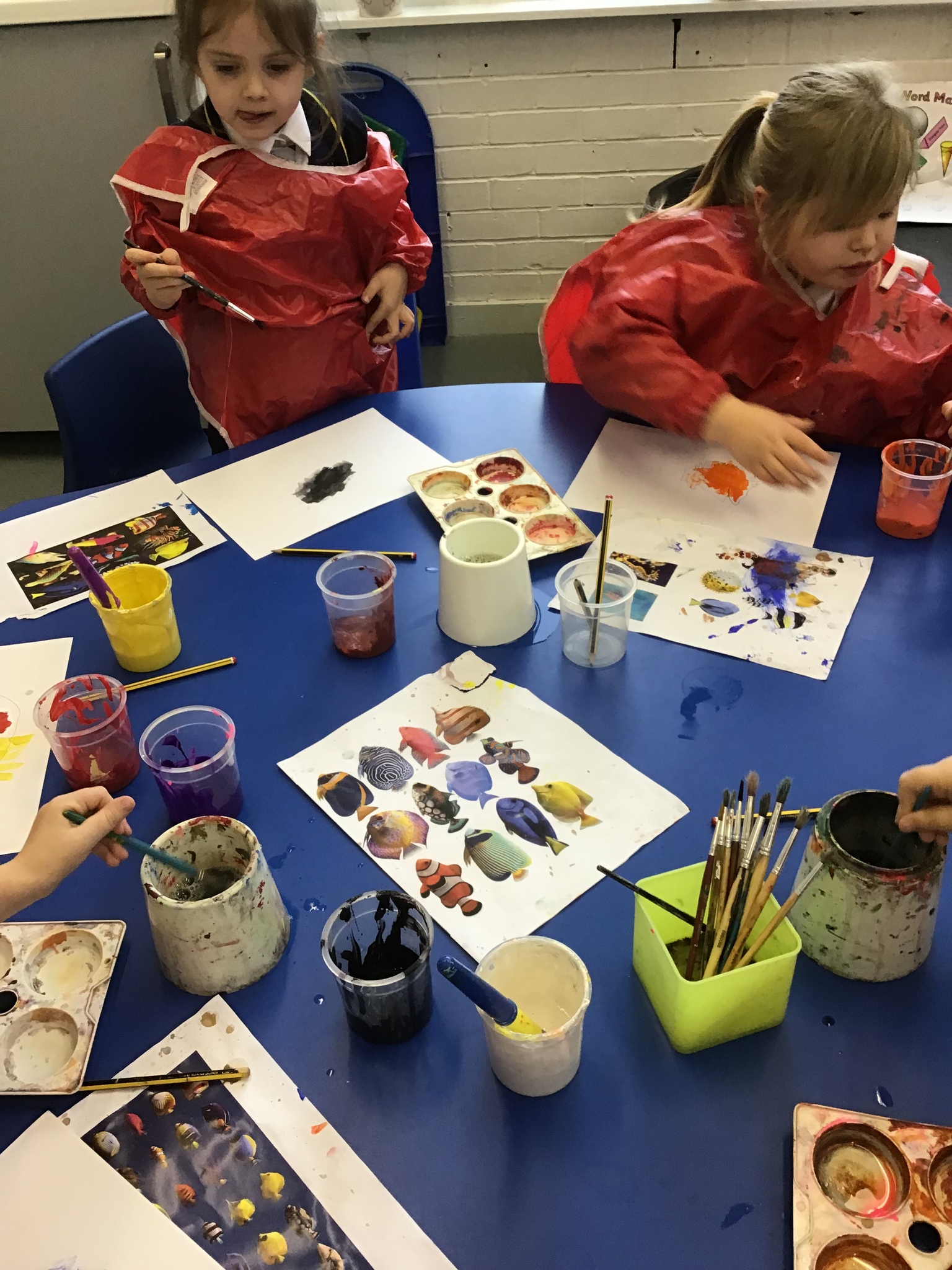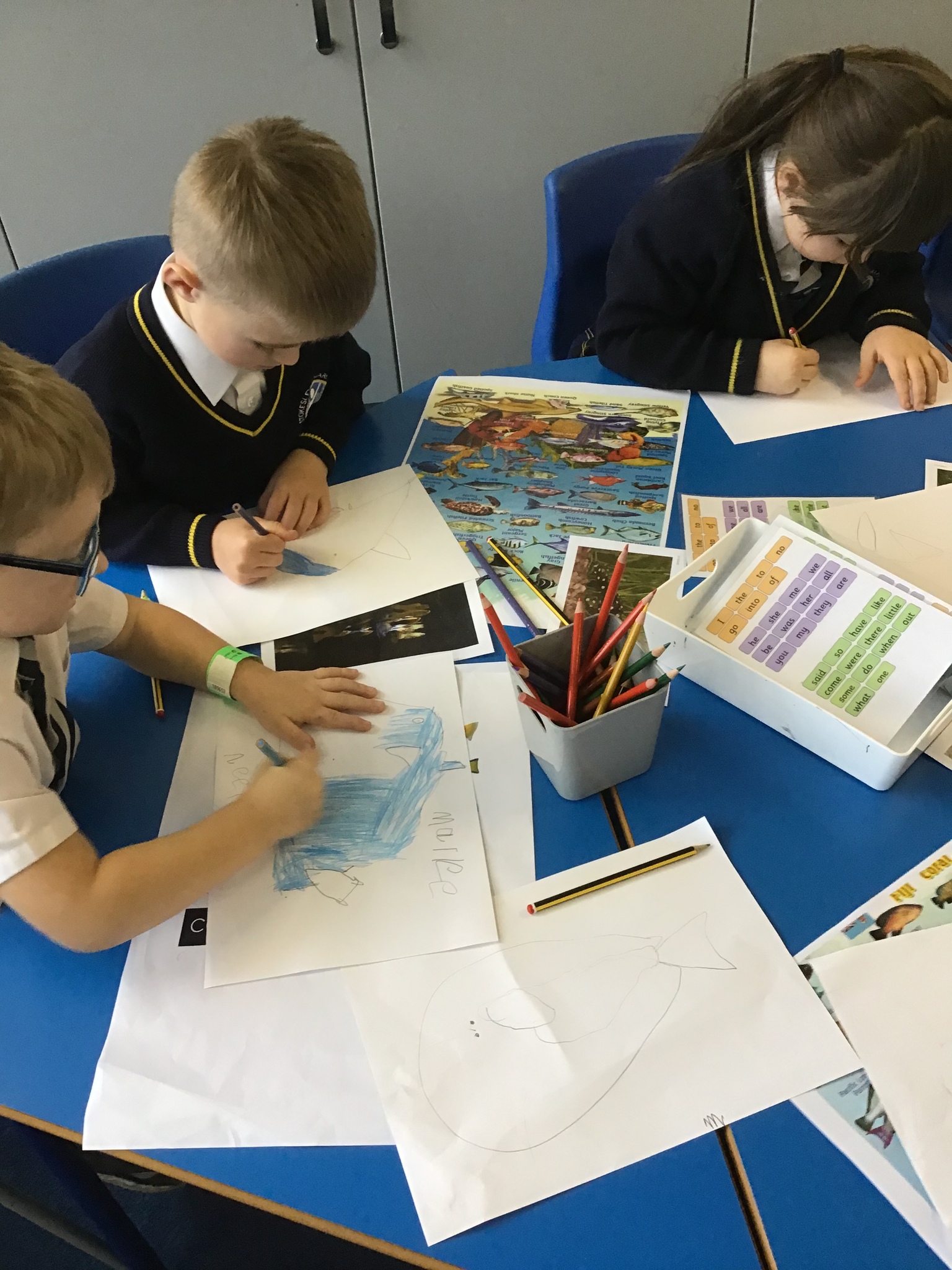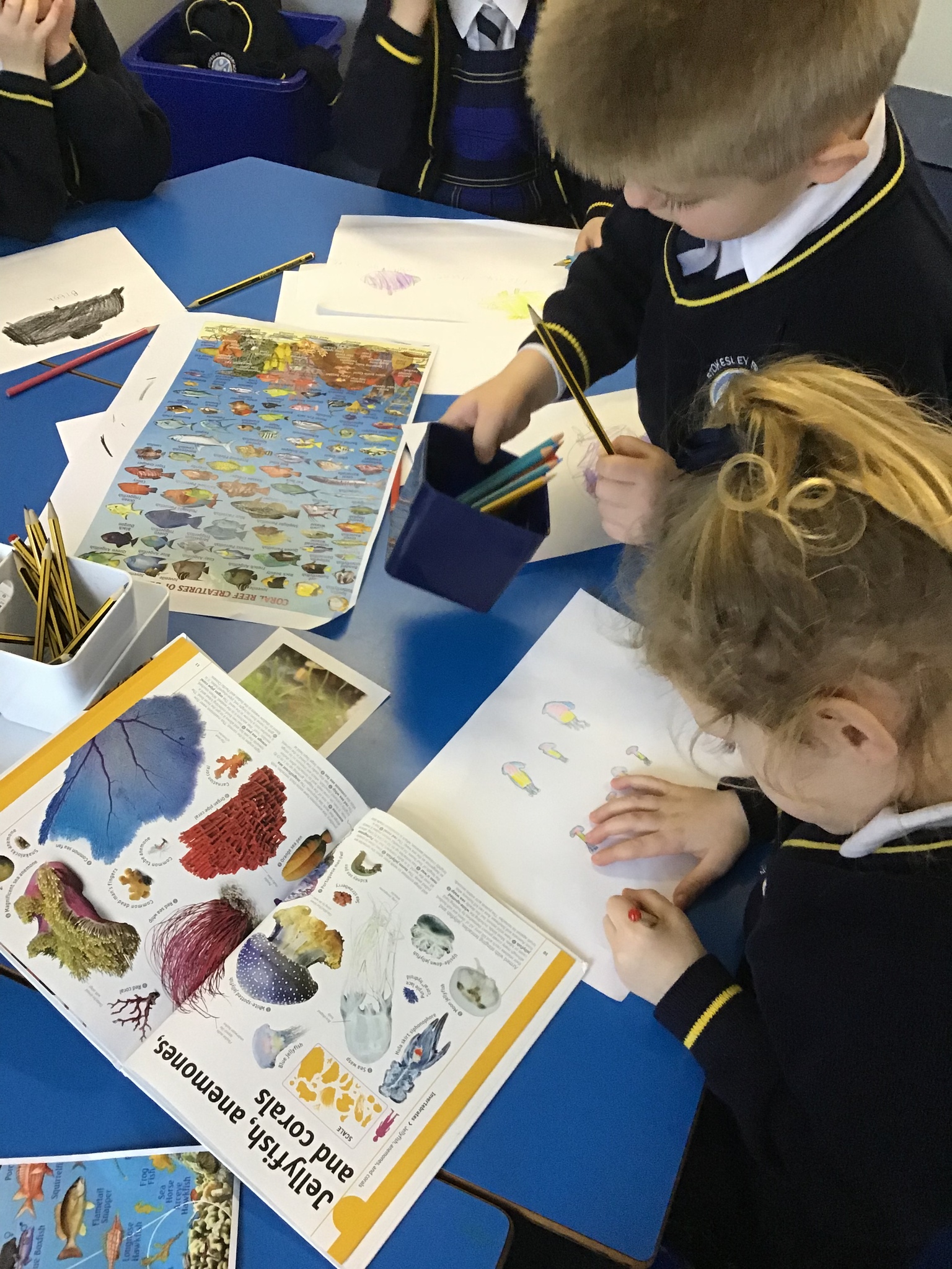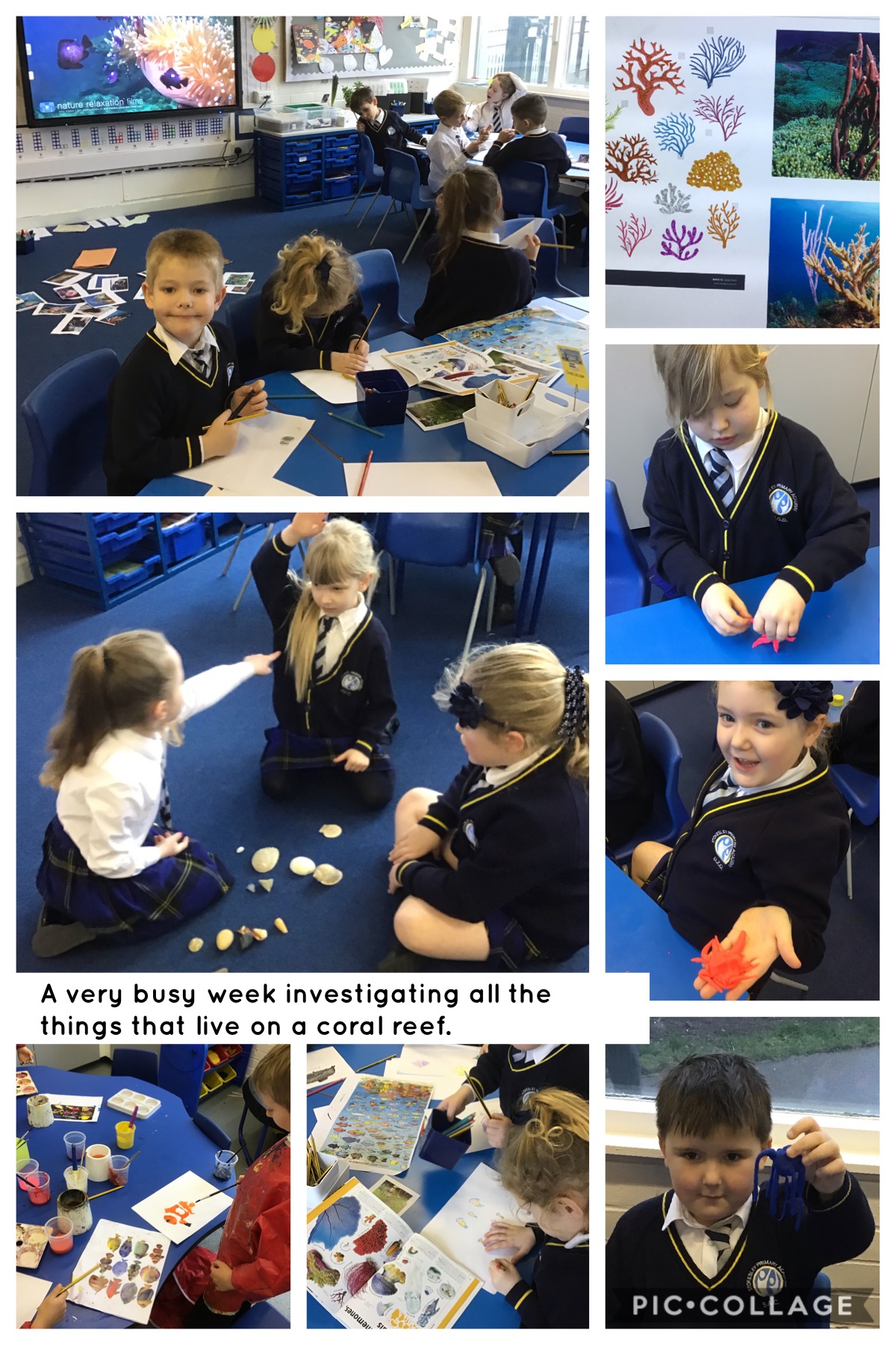 This week we have been investigating the creatures that live in the coral reefs and finding out what coral is. We have been drawing and painting the creatures that live on the reef as well as having a go at modelling coral with play dough. We have written facts that we already knew and spent time trying to find the answers to our questions. We have also been practising using our describing words playing guess my creature or spot my shell. The children have done some super writing describing the creatures of the coral reef and have worked very hard. Hopefully they will tell you all about what they have learnt so far.
