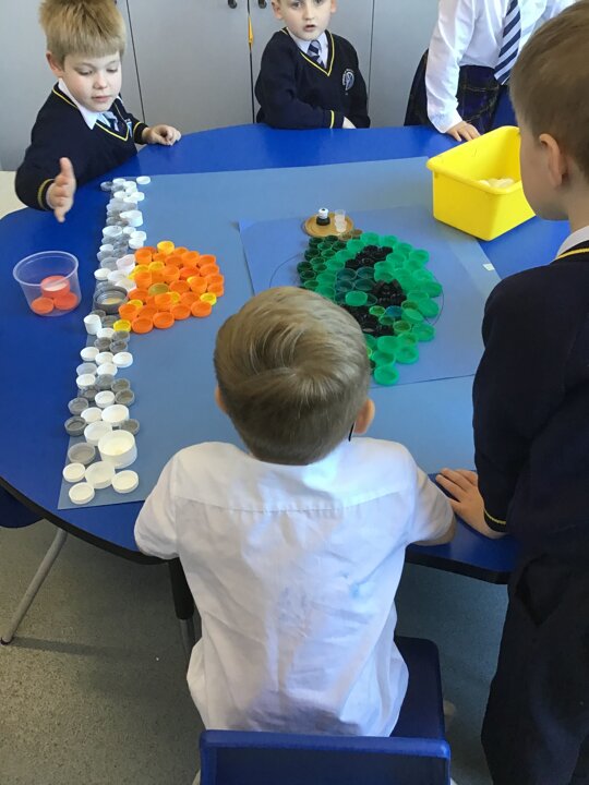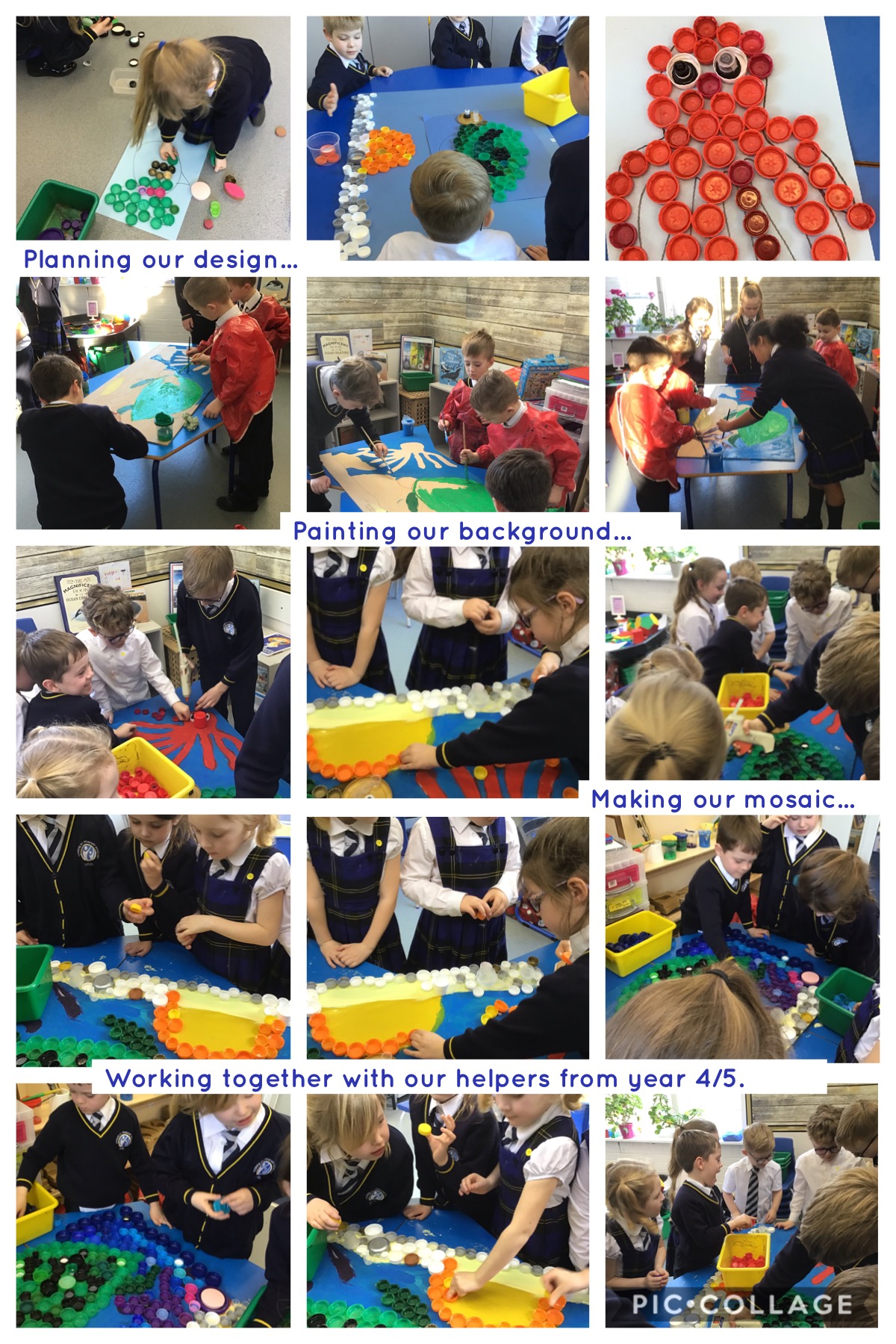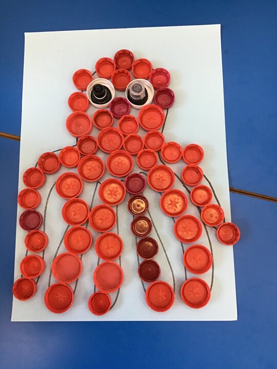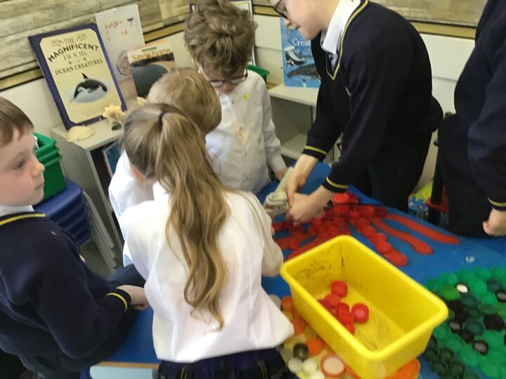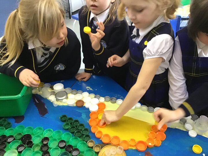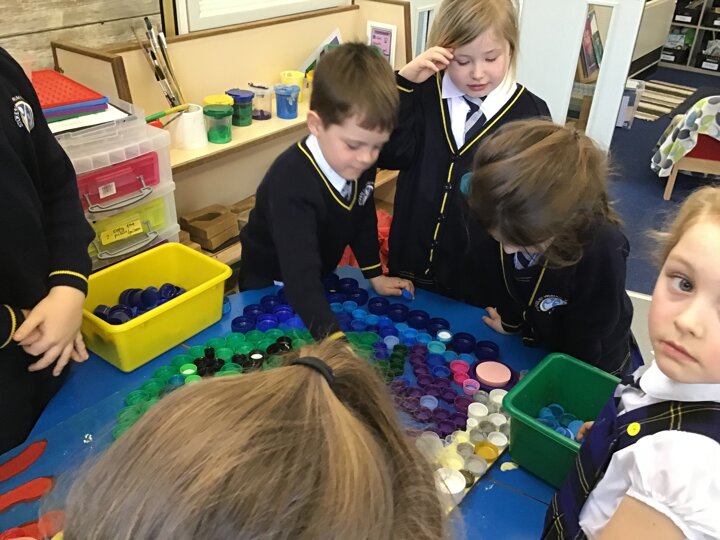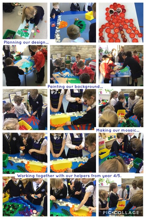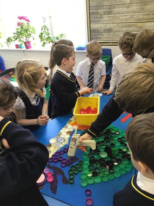 We decided to try and make something beautiful from all of the plastic bottle lids. We hope that seeing all of the lids will help people to think about how much plastic we use in just one week. We are really looking forward to seeing it up on display. Once again we really appreciated the help given by the year 4/5 class who helped us make our mosaic. We enjoyed working as a team and were really glad that they could help us with the tricky hot glue!