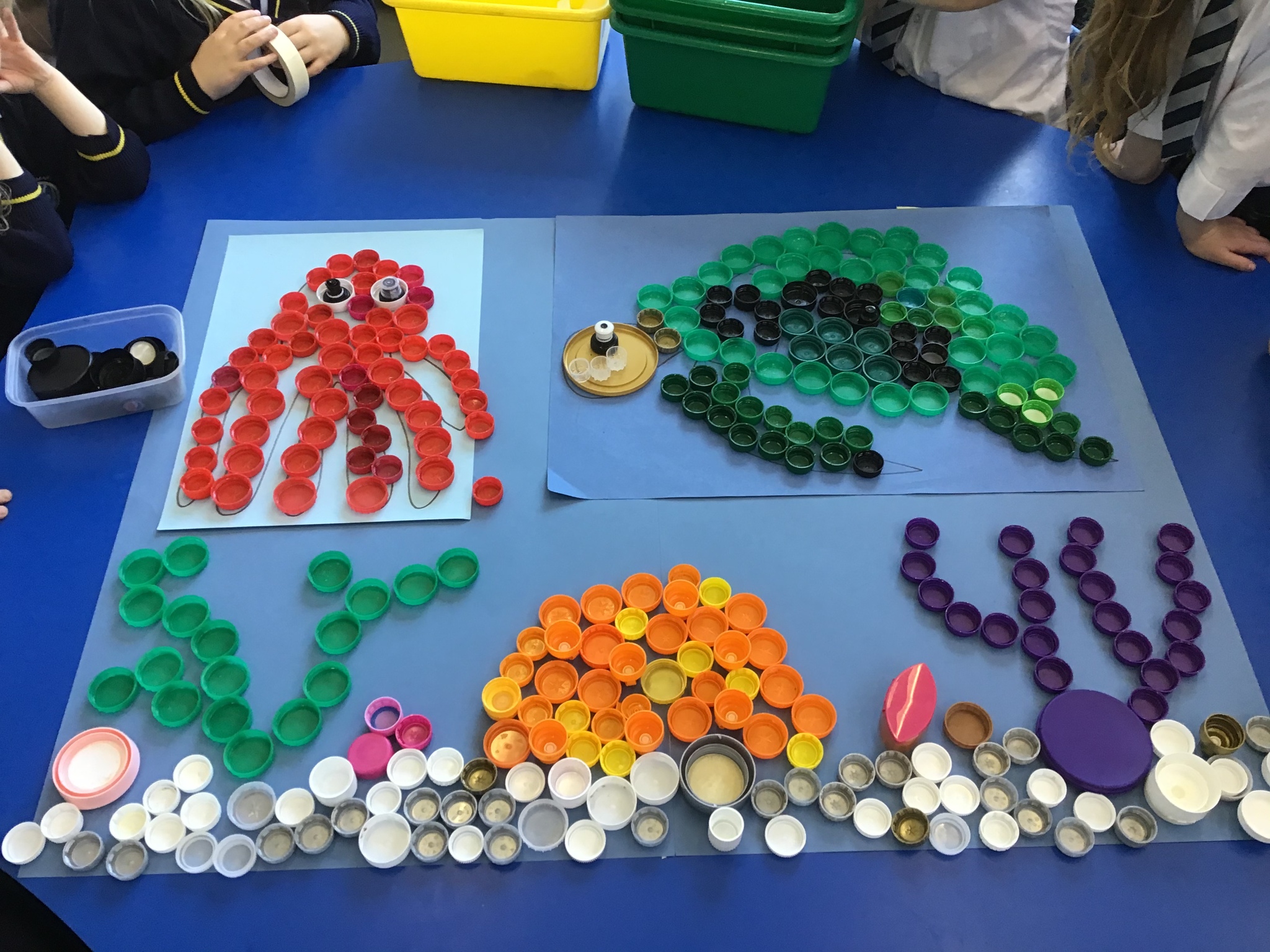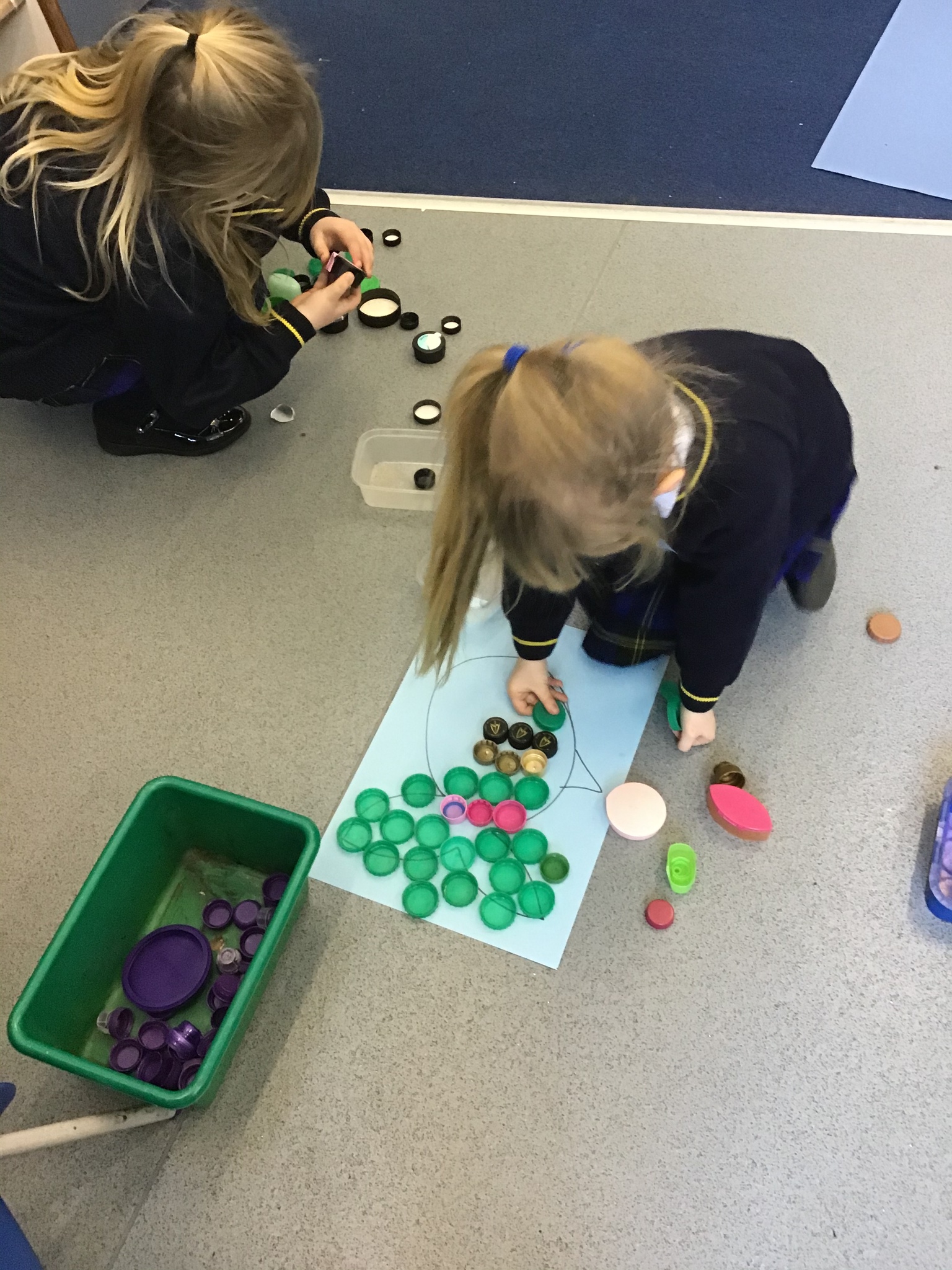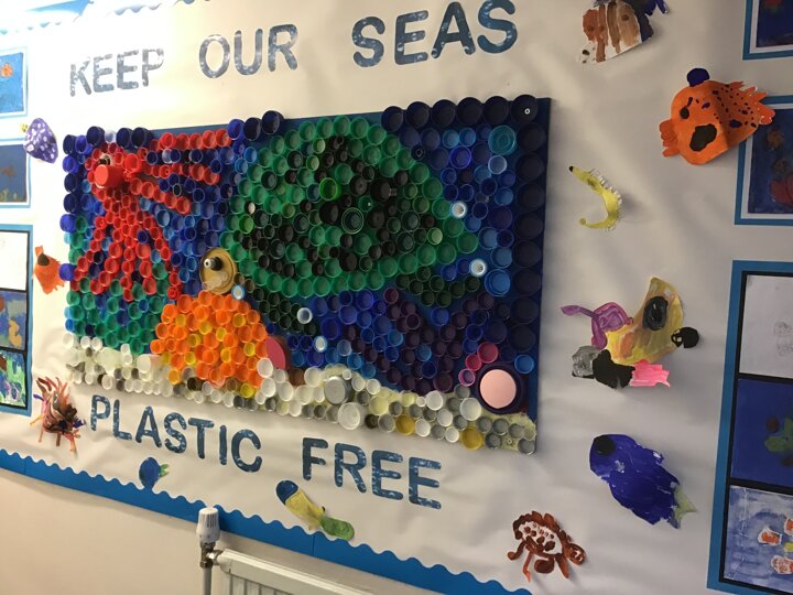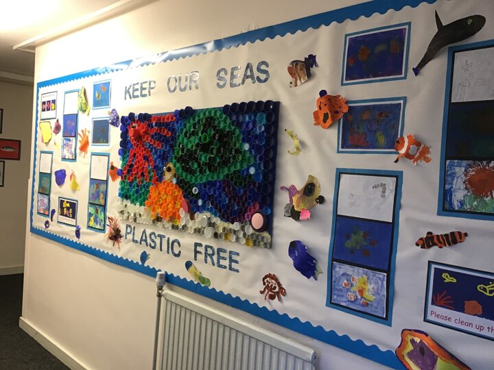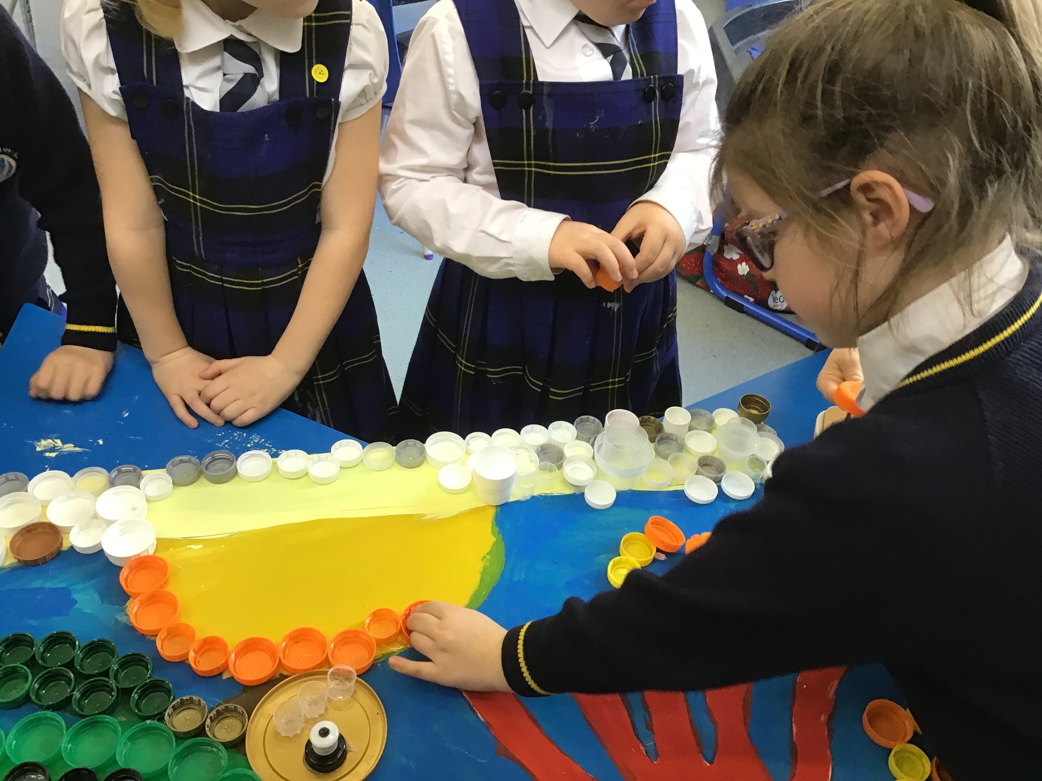 We decided to try and make something beautiful from all of the plastic bottle lids. We hope that seeing all of the lids will help people to think about how much plastic we use in just one week. We are really looking forward to seeing it up on display. Once again we really appreciated the help given by the year 4/5 class who helped us make our mosaic. We enjoyed working as a team and were really glad that they could help us with the tricky hot glue!