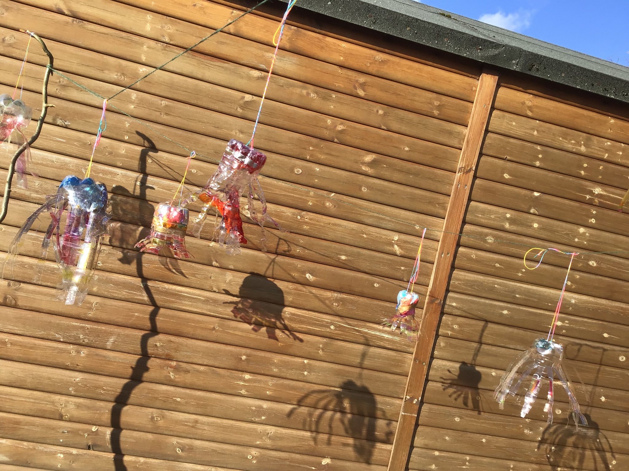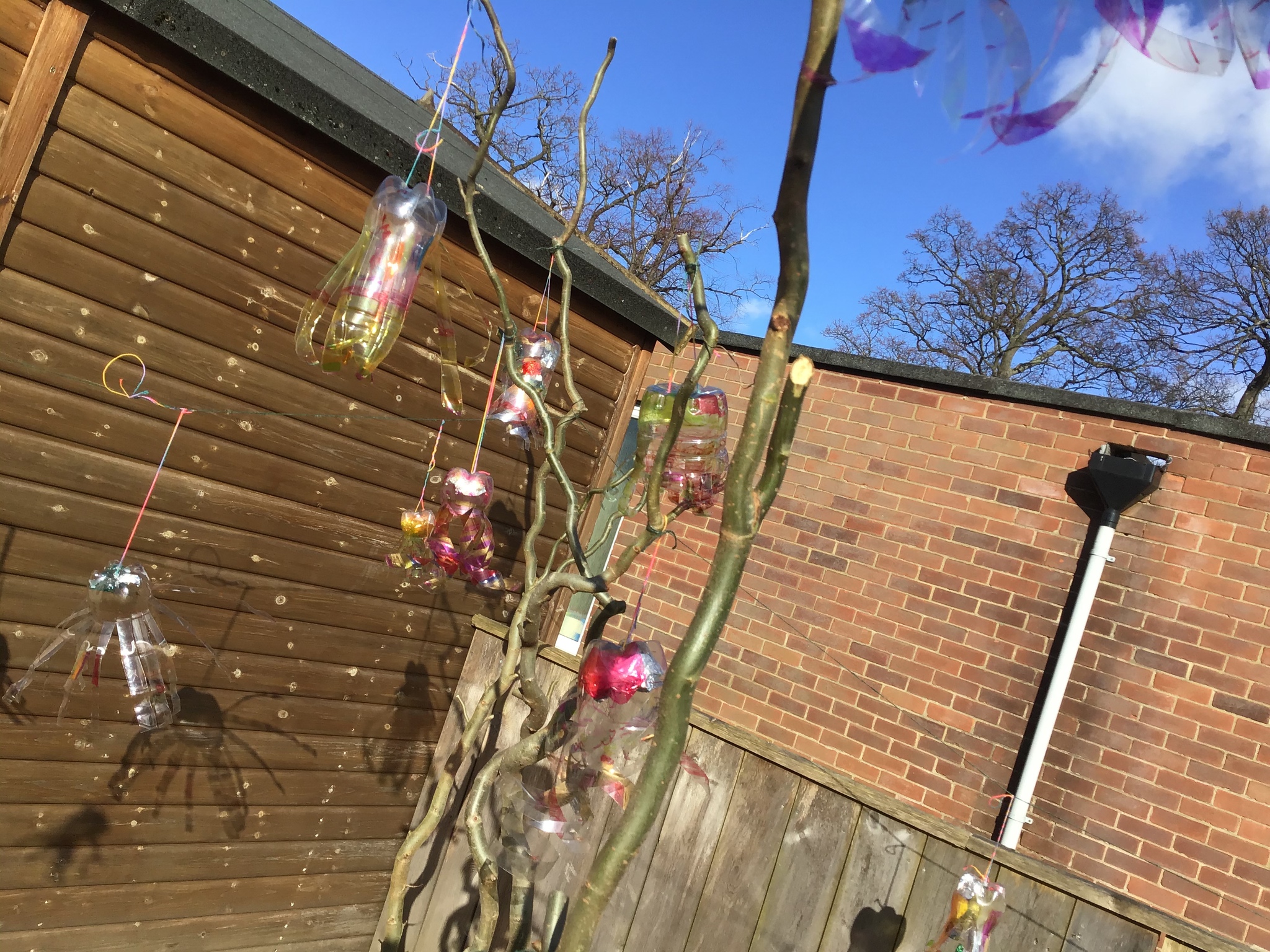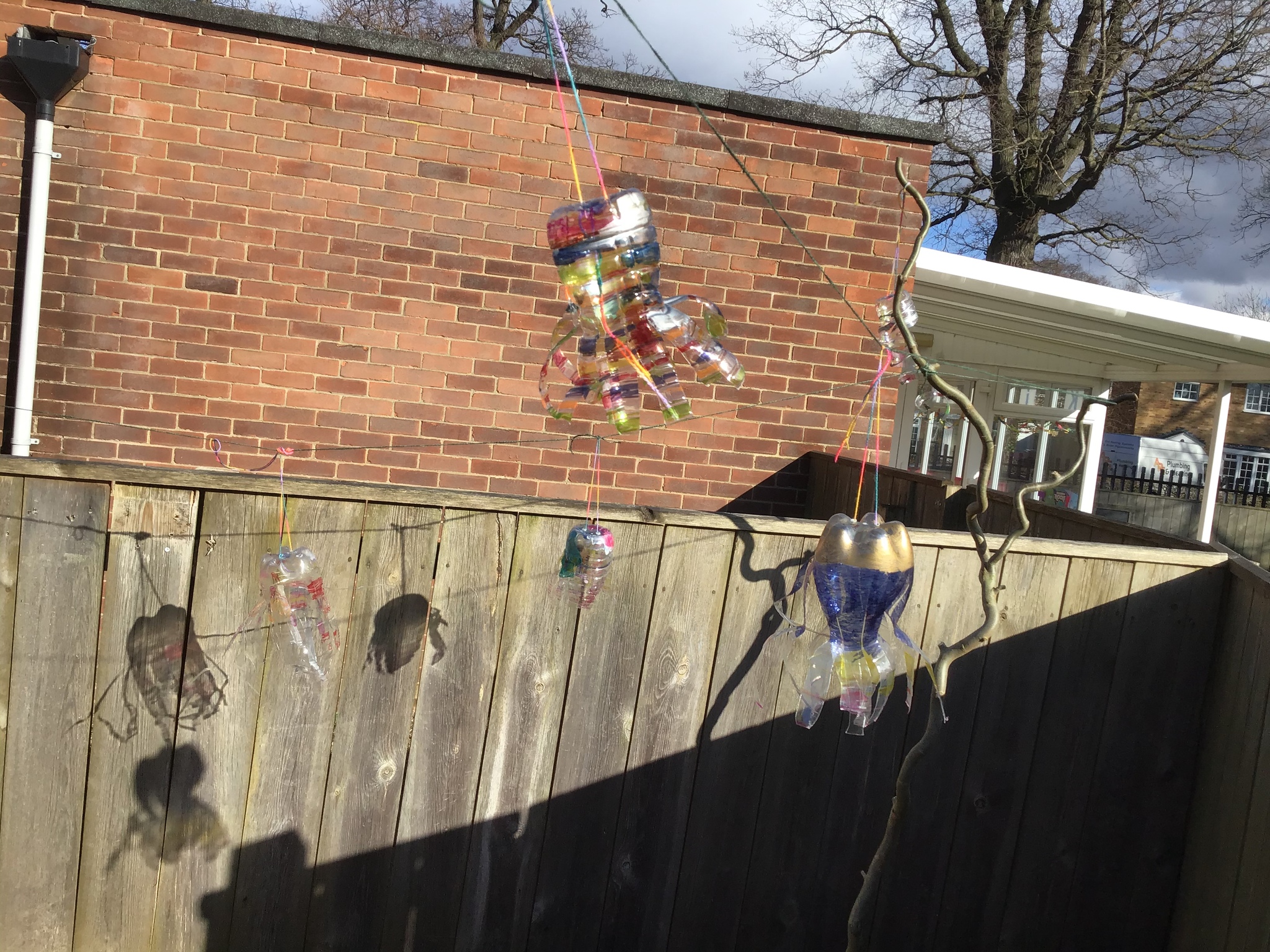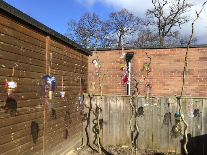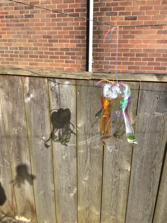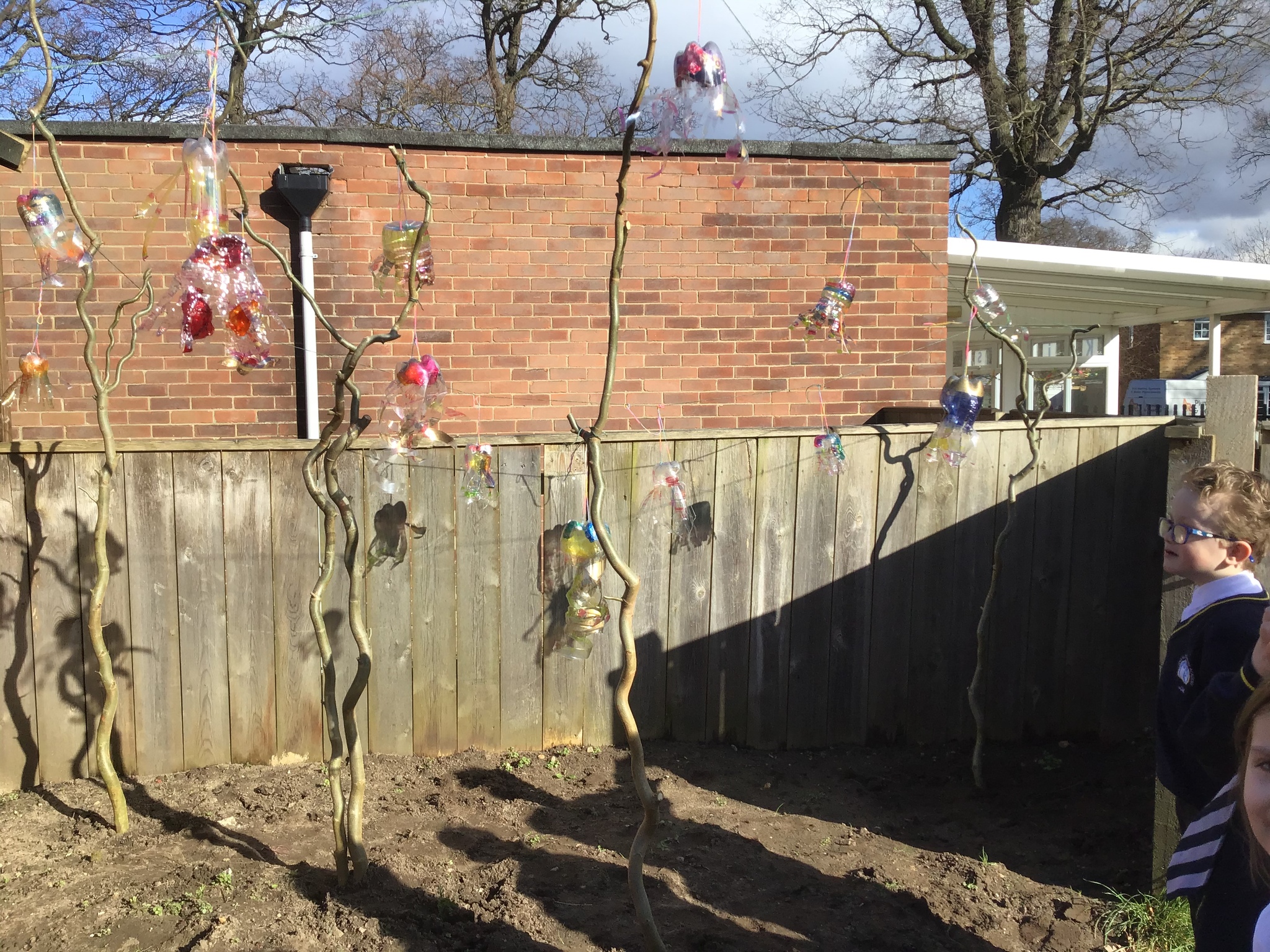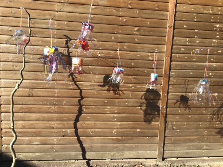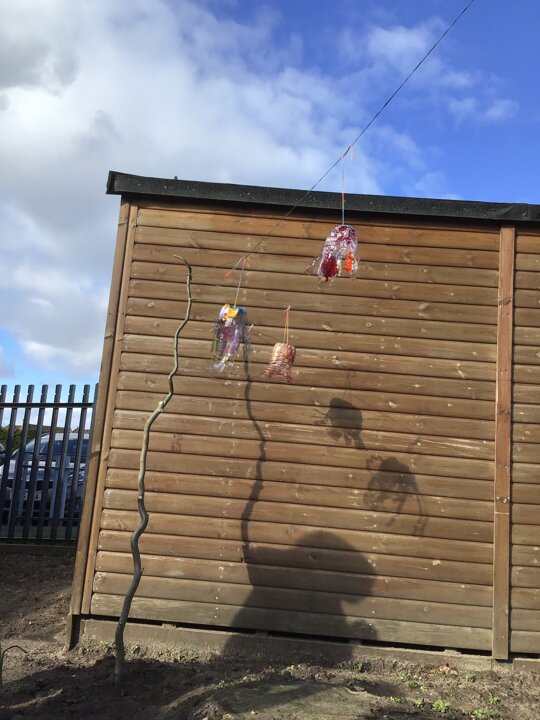 Today we worked hard to finish our Jellyfish and put them outside in our jellyfish garden. It was lovely to see them blowing in the wind and to look at the colours in their shadows. We hope that everyone enjoys looking at them as they walk past on their way to school. We hope it helps remind people to re-use and recycle plastic whenever they can. We are looking forward to getting busy planting in our garden when the weather is a bit warmer.