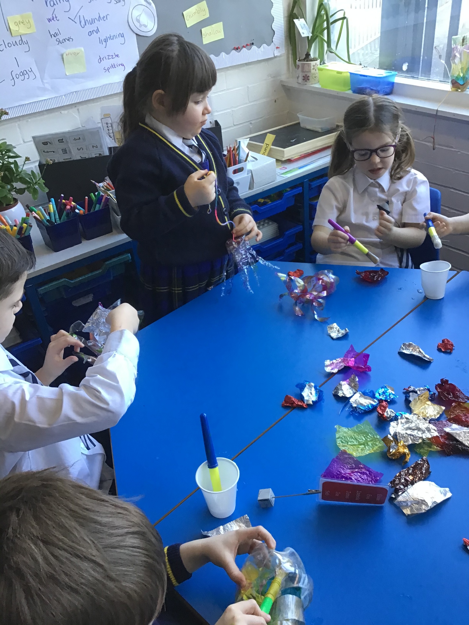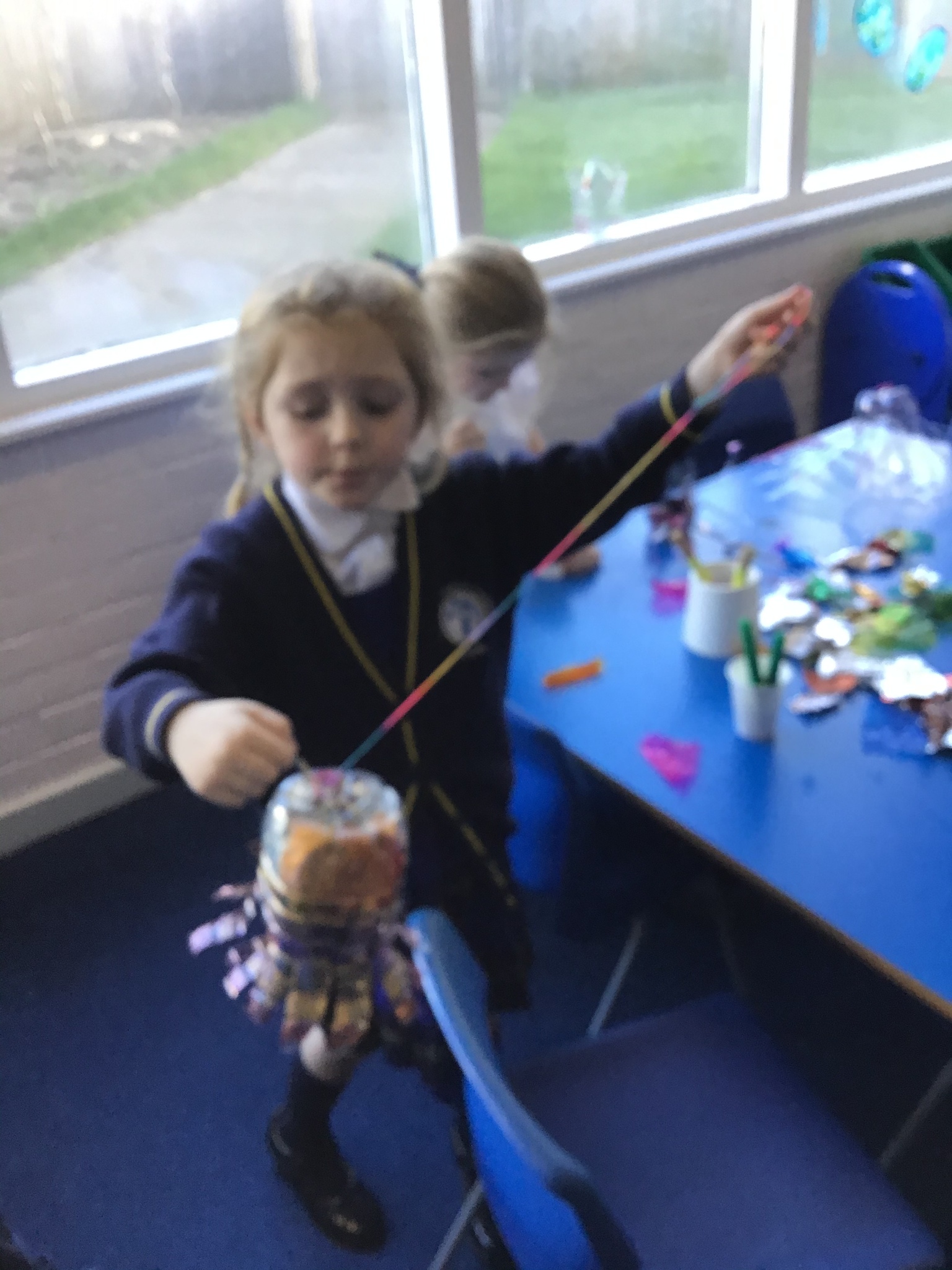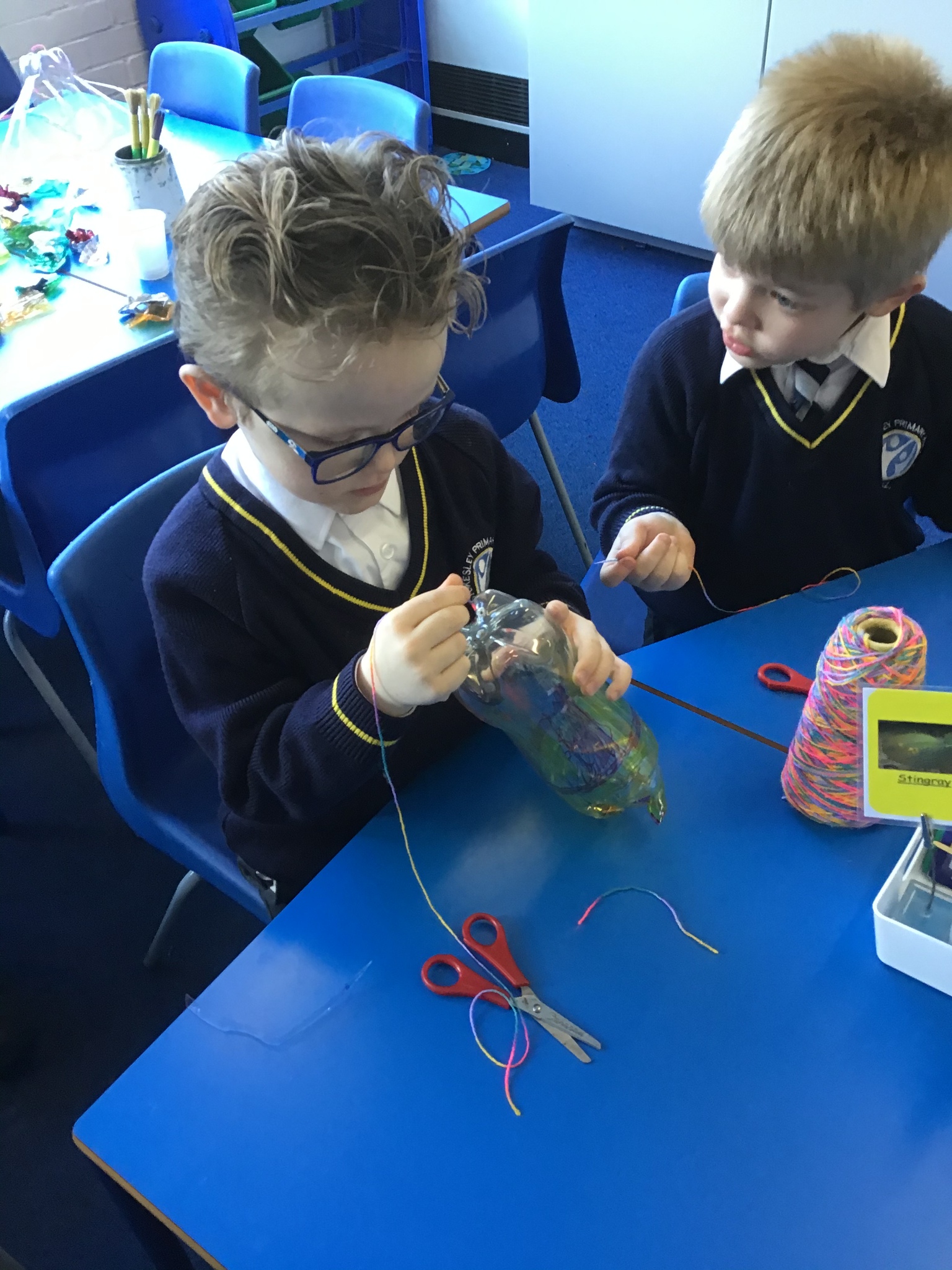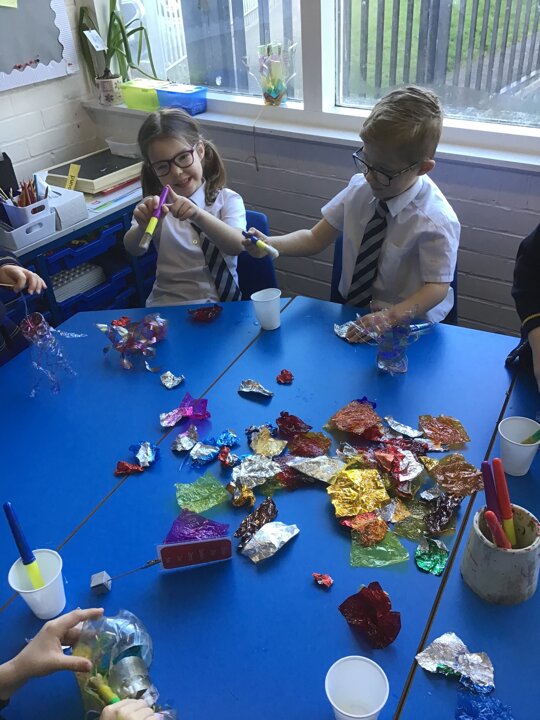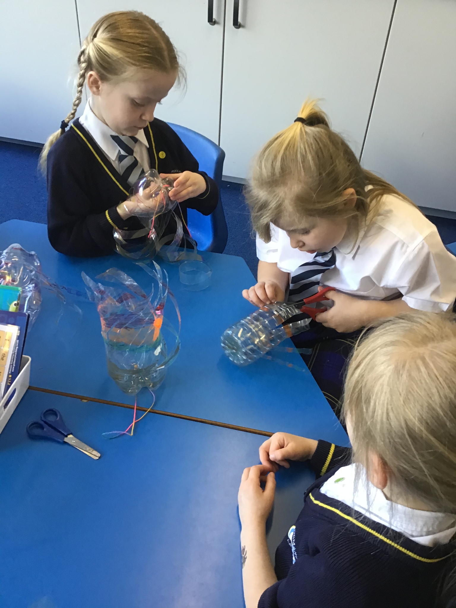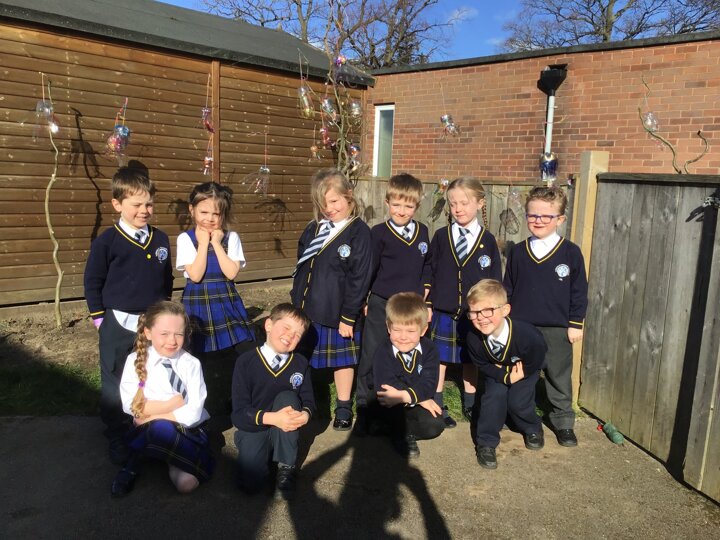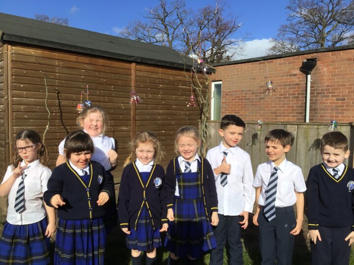 Today we worked hard to finish our Jellyfish and put them outside in our jellyfish garden. It was lovely to see them blowing in the wind and to look at the colours in their shadows. We hope that everyone enjoys looking at them as they walk past on their way to school. We hope it helps remind people to re-use and recycle plastic whenever they can. We are looking forward to getting busy planting in our garden when the weather is a bit warmer.