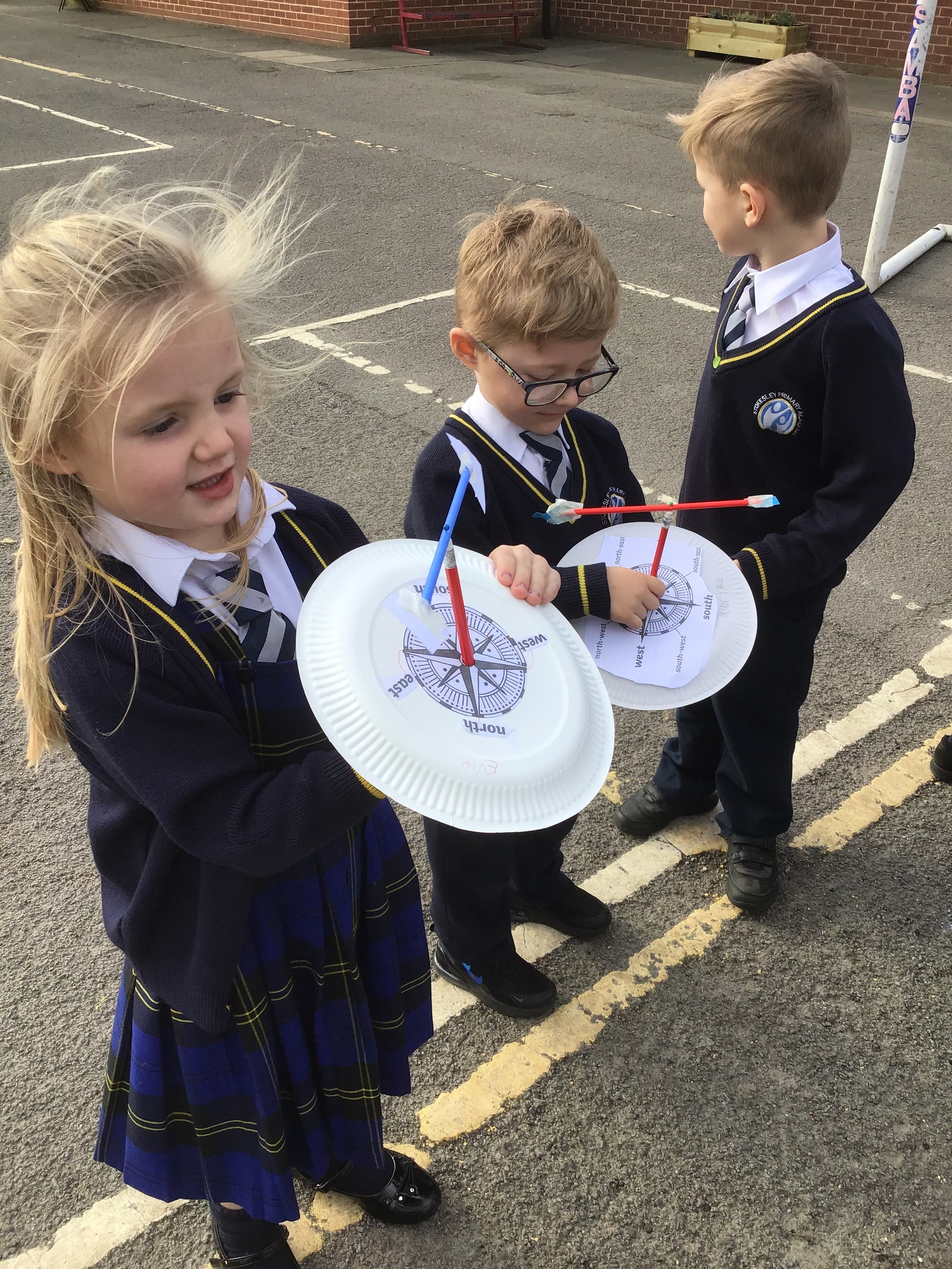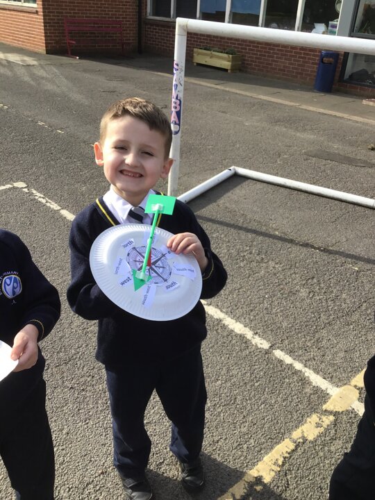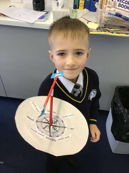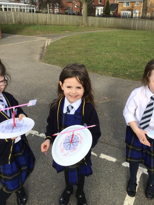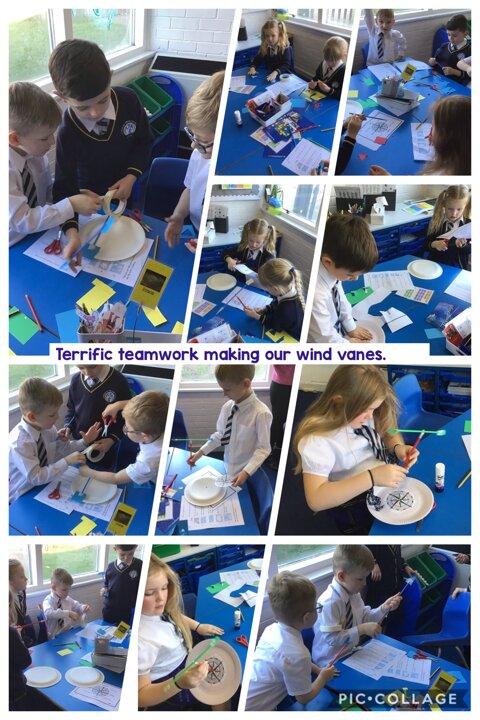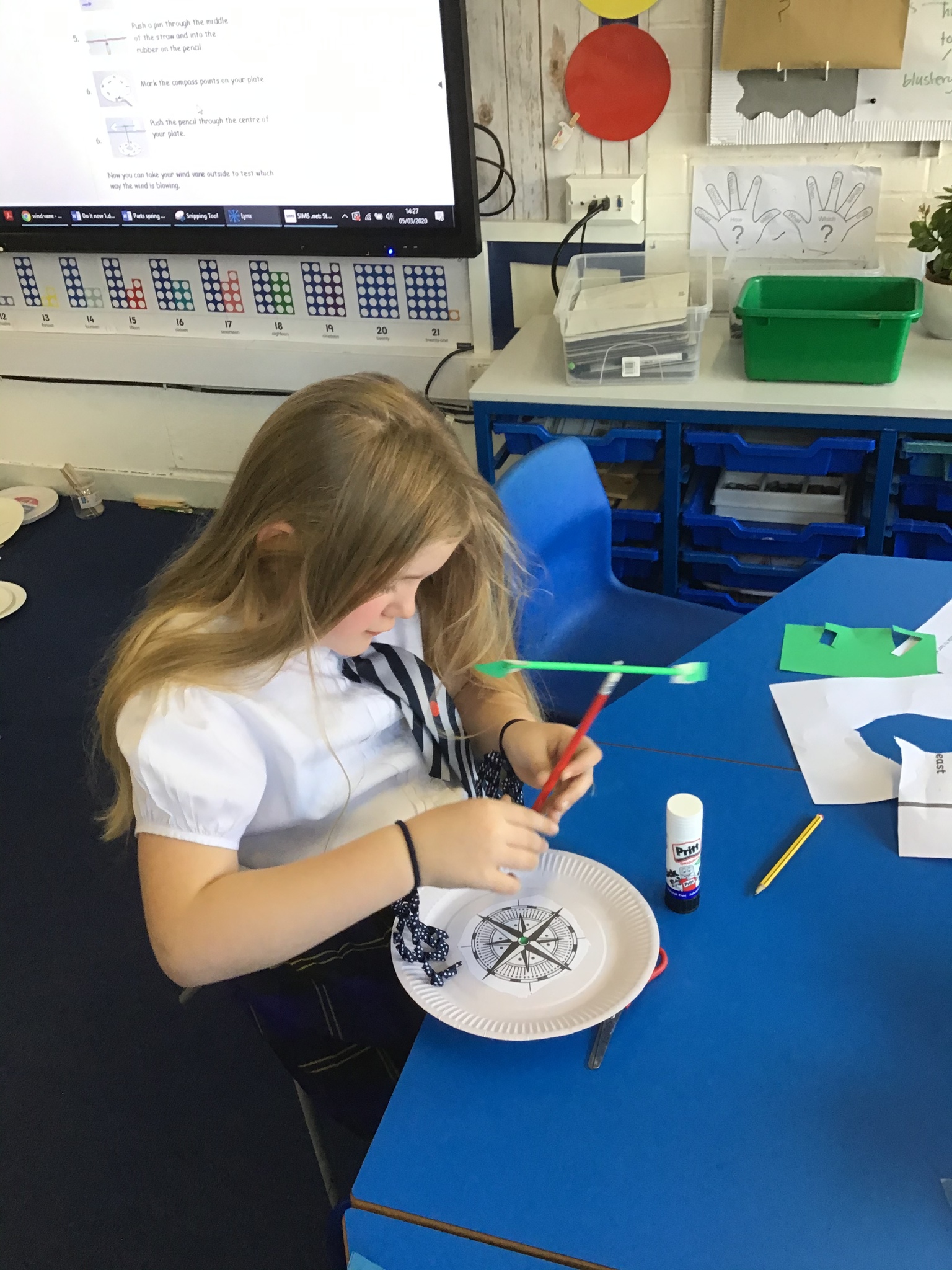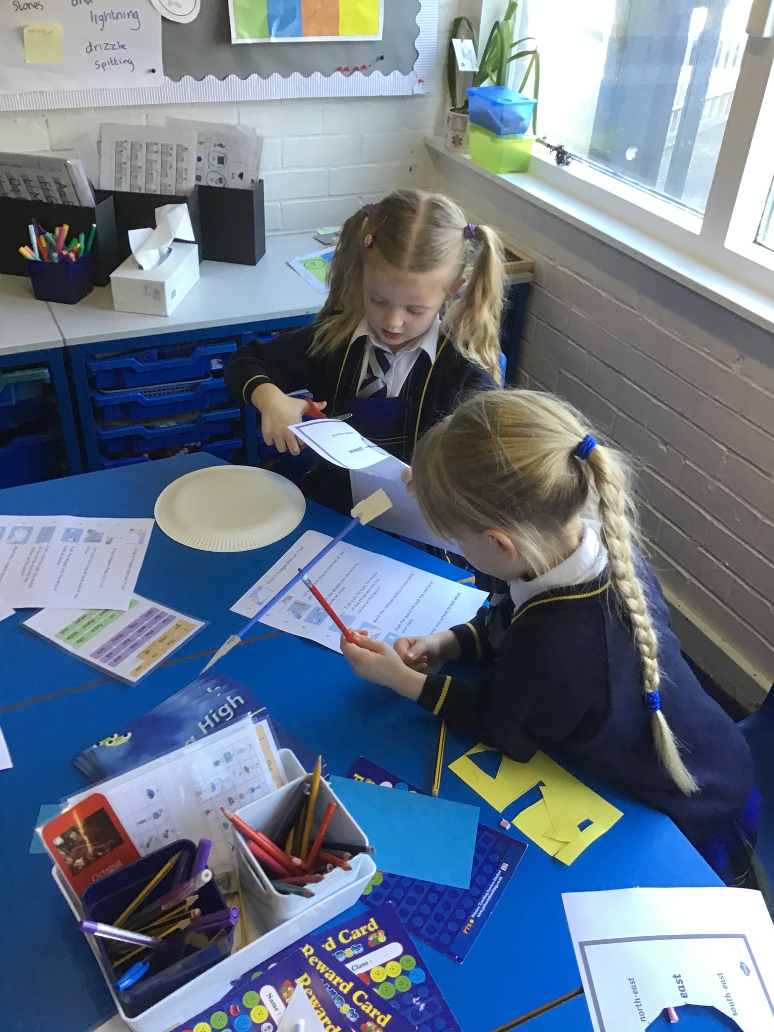 We are investigating the weather. We made a wind vane so that we can find out which direction the wind is coming from. We had to read the instructions very carefully and cut and join the pieces so that it could still move in the wind. Lots of terrific teamwork was needed as it was a bit fiddly!! We enjoyed testing them outside. We used a compass to help us find out which way was North.