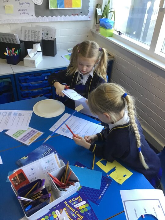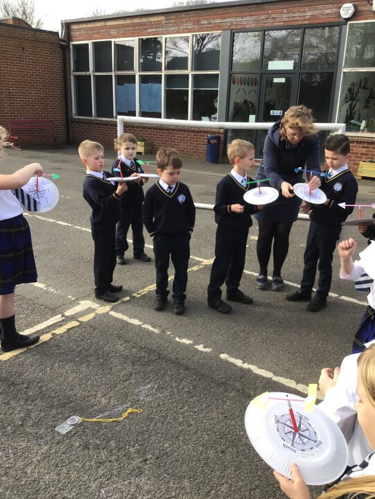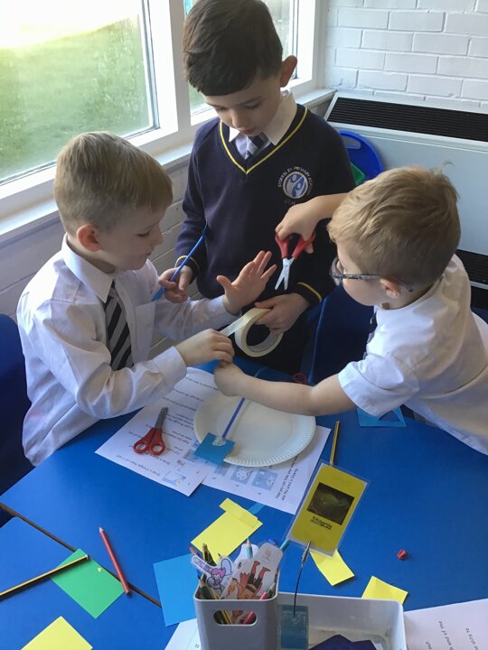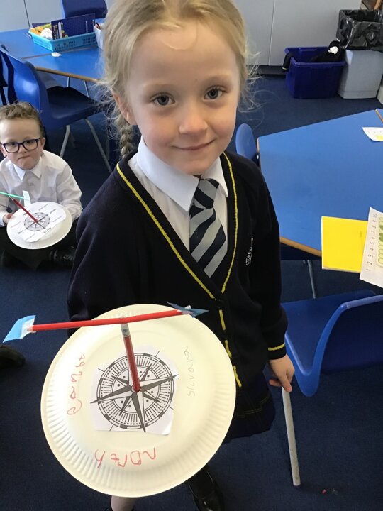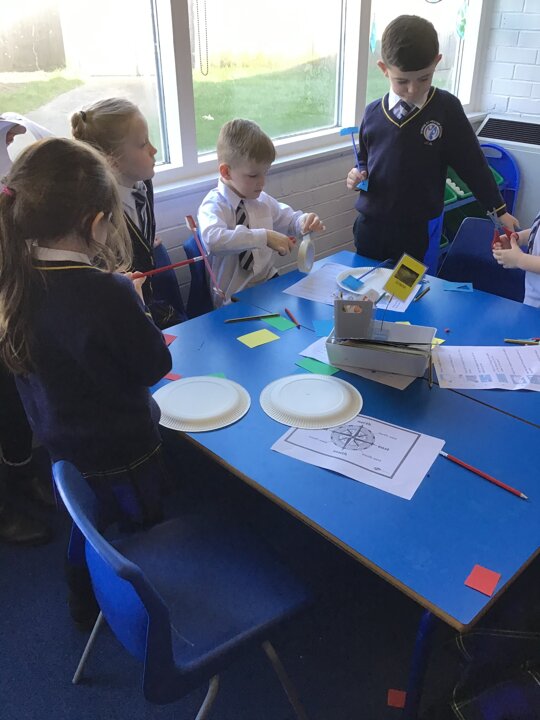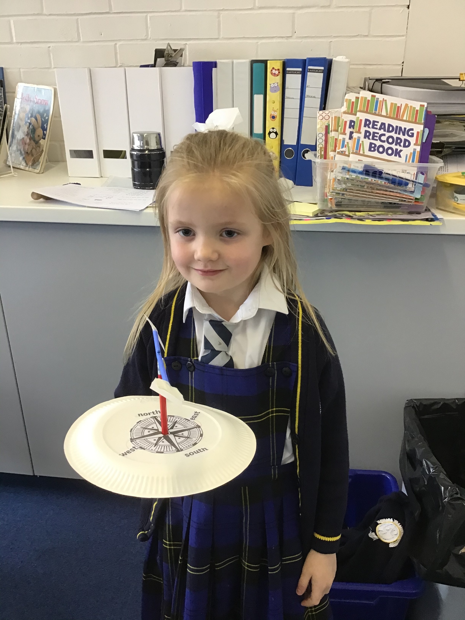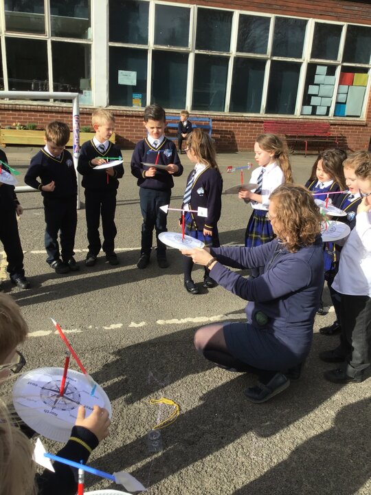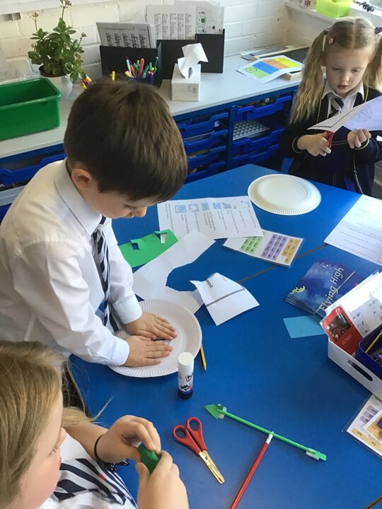 We are investigating the weather. We made a wind vane so that we can find out which direction the wind is coming from. We had to read the instructions very carefully and cut and join the pieces so that it could still move in the wind. Lots of terrific teamwork was needed as it was a bit fiddly!! We enjoyed testing them outside. We used a compass to help us find out which way was North.